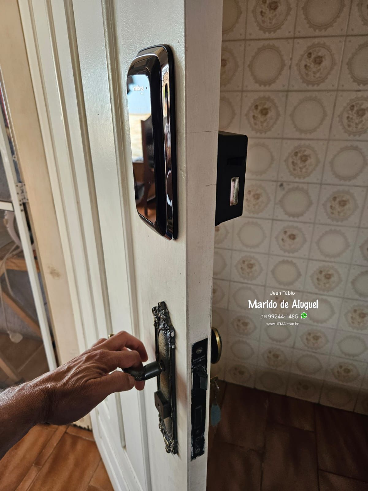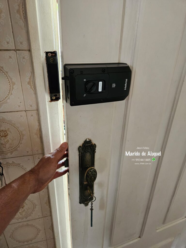 Depois instalei o conjunto da fechadura, fiz a fixação completa e a regulagem do trinco para garantir que a porta fechasse suavemente e com total segurança. Também configurei a senha de acesso e testei o funcionamento para ter certeza de que tudo estava operando perfeitamente.