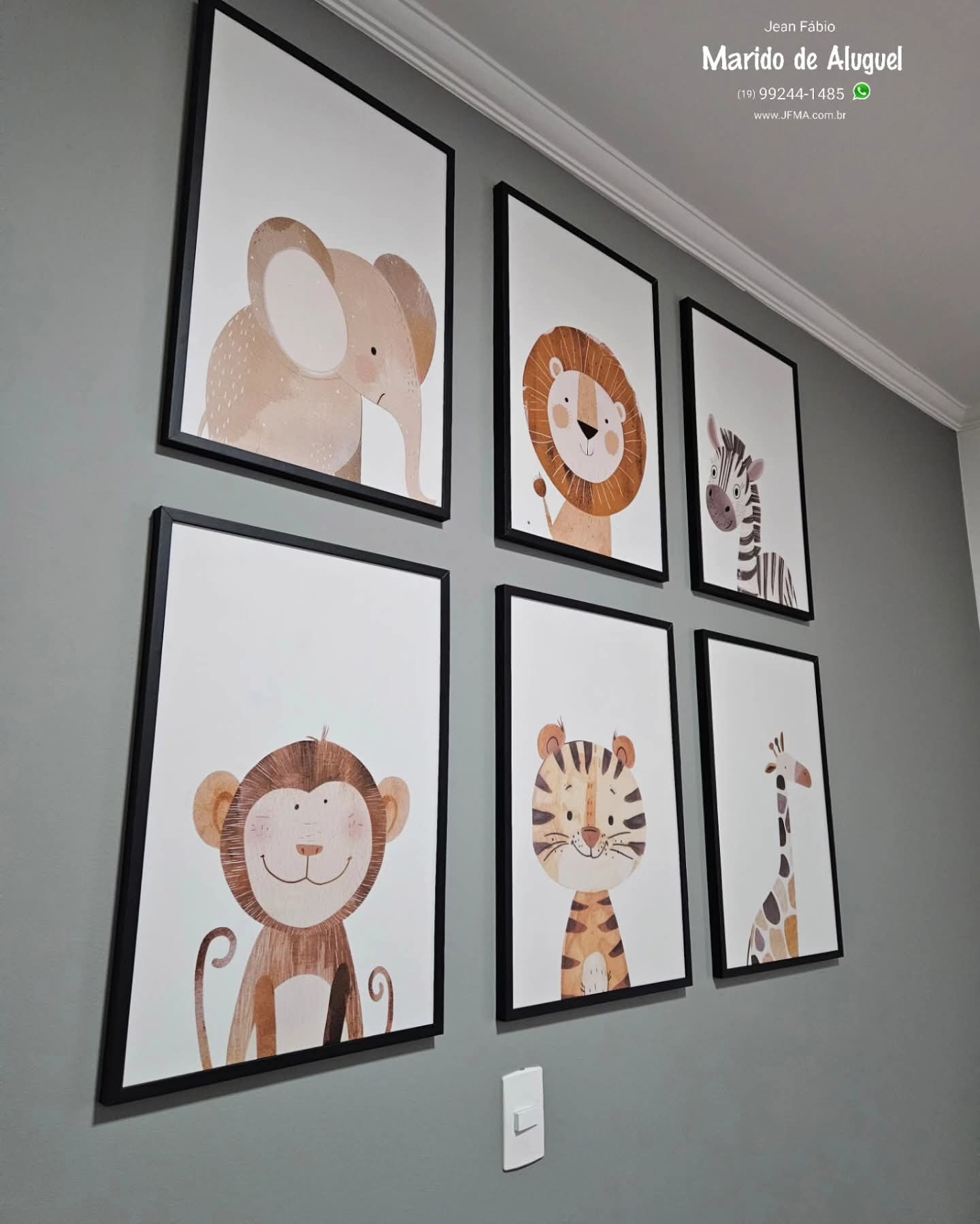 Nesse quartinho de bebê, a futura mamãe queria deixar tudo pronto para a chegada do pequeno. Instalei seis quadros infantis na parede, deixando o ambiente ainda mais aconchegante 💛