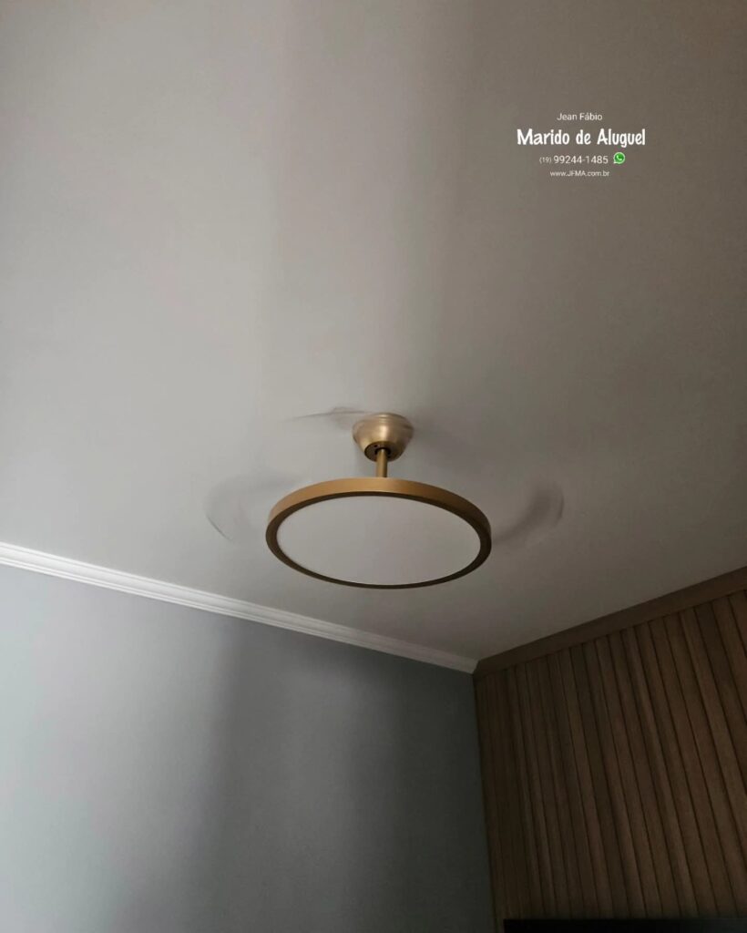 Nessa casa fiz a instalação de um ventilador de teto com pás retráteis, aquele modelo moderno que quando você liga as pás se abrem e começam a ventilar normalmente. Já quando desliga, as pás se recolhem e ele fica com aparência de um lustre comum, deixando o ambiente bonito e discreto.