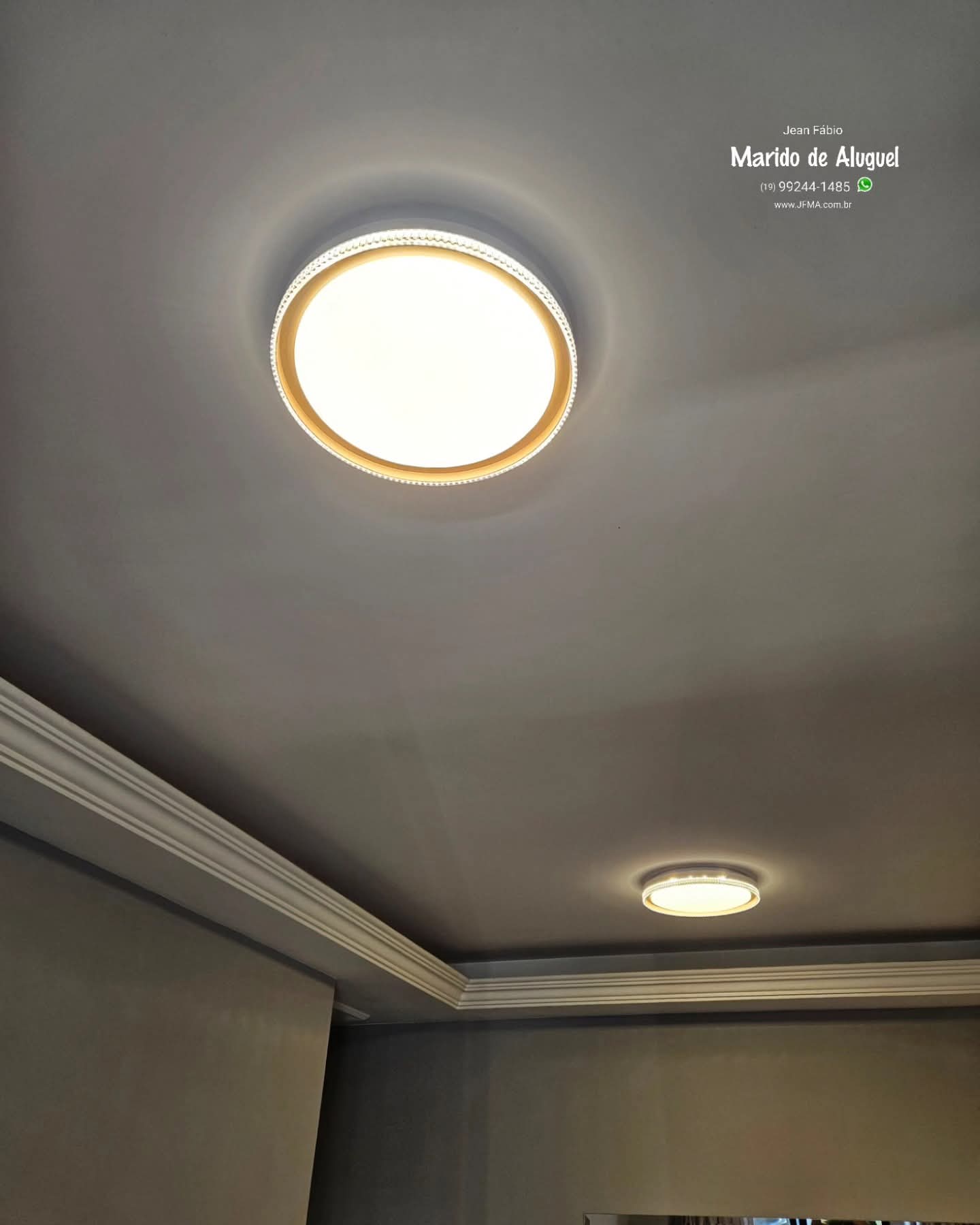 Além do ventilador, também instalei mais dois lustres no teto da sala, todos bem alinhados e posicionados para valorizar a iluminação do ambiente. Em outro ponto da casa, fiz a instalação de plafons/lustres no teto, garantindo uma iluminação mais uniforme e funcional.
