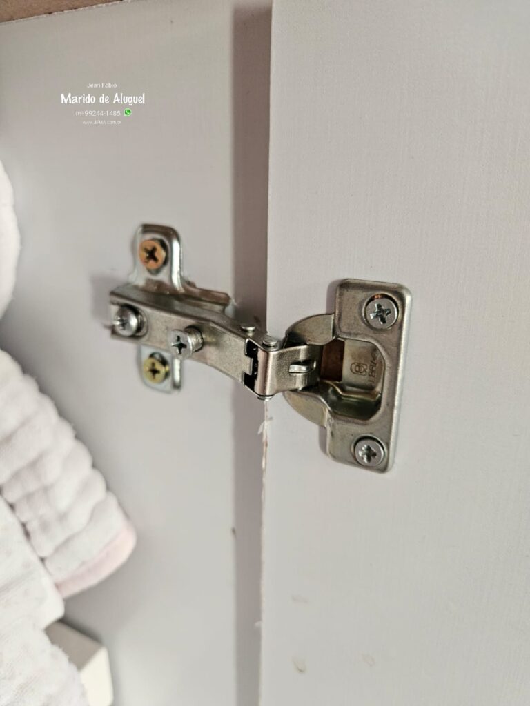 Então fiz a fixação novamente das dobradiças na estrutura da cômoda e na porta, utilizando os parafusos adequados pra garantir firmeza. Depois disso, realizei a regulagem das dobradiças, ajustando o alinhamento pra que a porta abrisse e fechasse corretamente. No final, a porta ficou bem firme, alinhada e funcionando perfeitamente.
