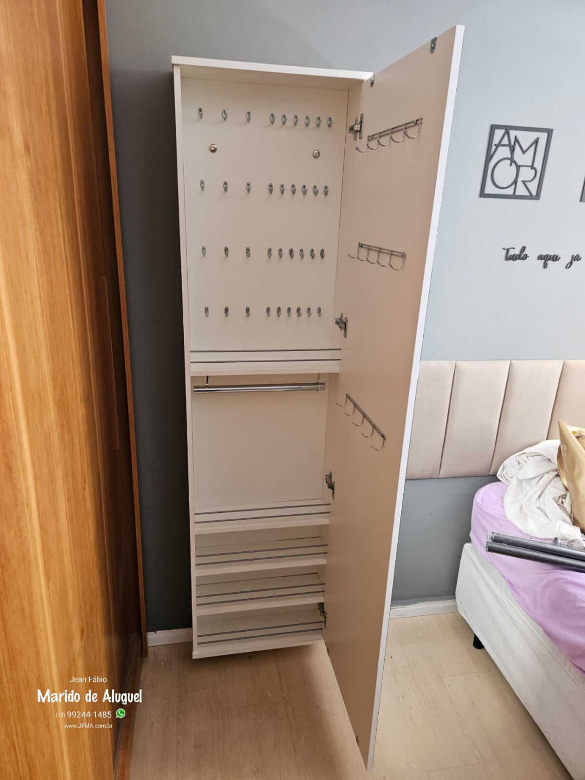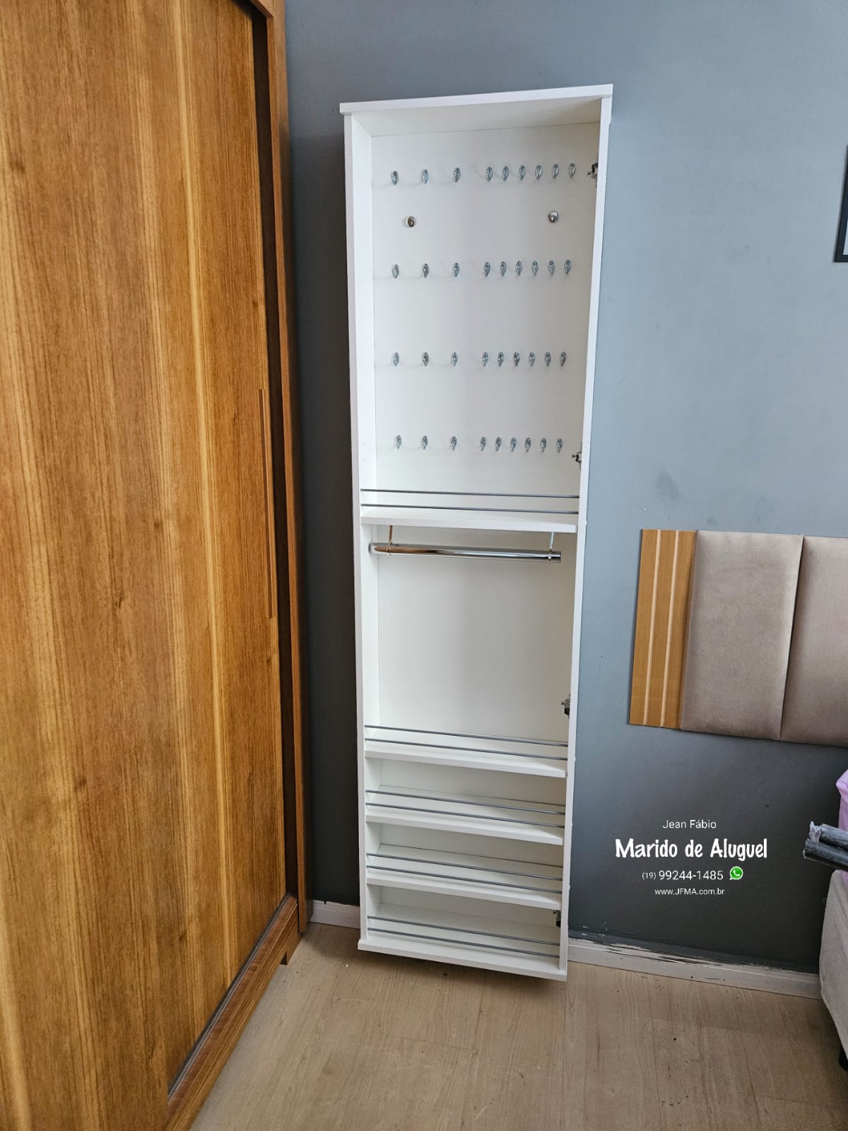 Neste serviço realizei a montagem e a instalação de um porta-bijuterias de parede, que funciona como uma espécie de penteadeira compacta.