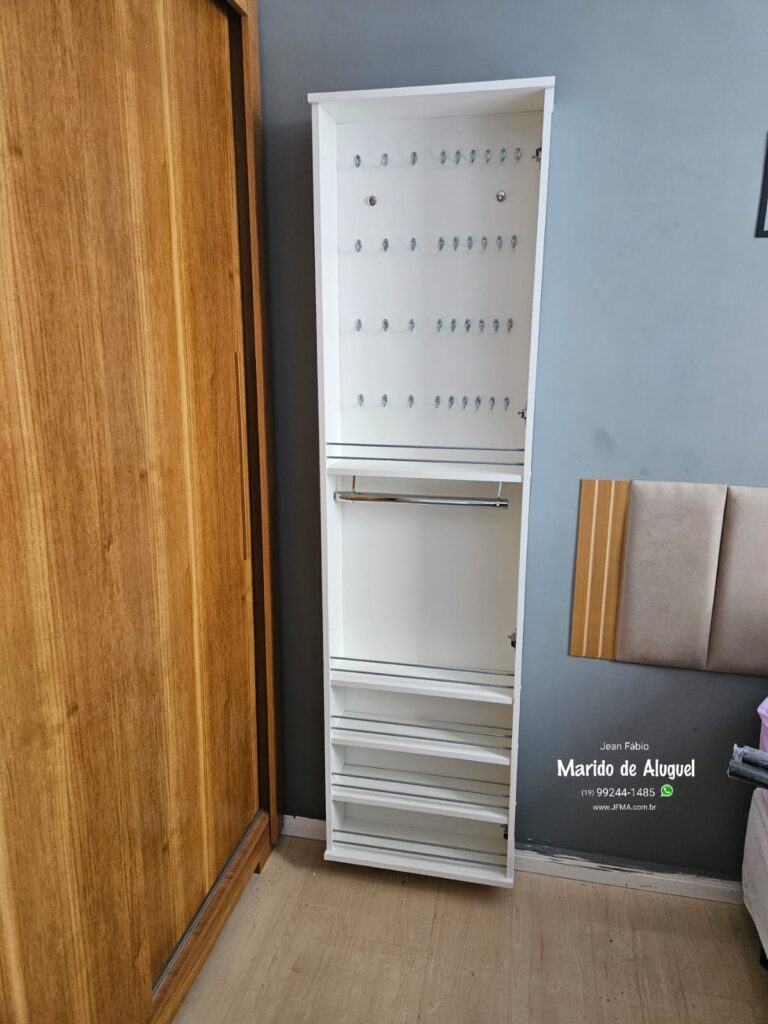 O móvel é projetado para guardar bijuterias e acessórios de forma organizada. Ele possui compartimentos internos para armazenar as peças e uma porta com espelho na parte externa, permitindo que a pessoa experimente as bijuterias e já se olhe no espelho para ver como ficou.