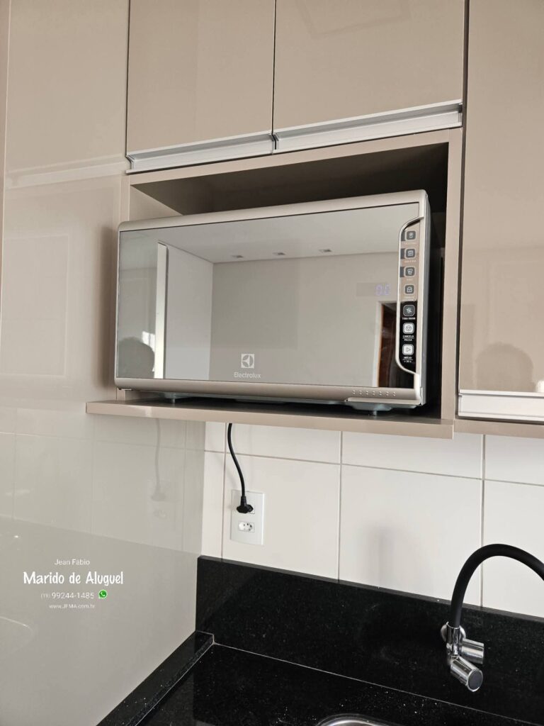 A cliente instalou o micro-ondas no nicho do armário, mas o plugue não encaixava na tomada existente, que era de 10 amperes, enquanto o aparelho precisava de uma tomada de 20 amperes.