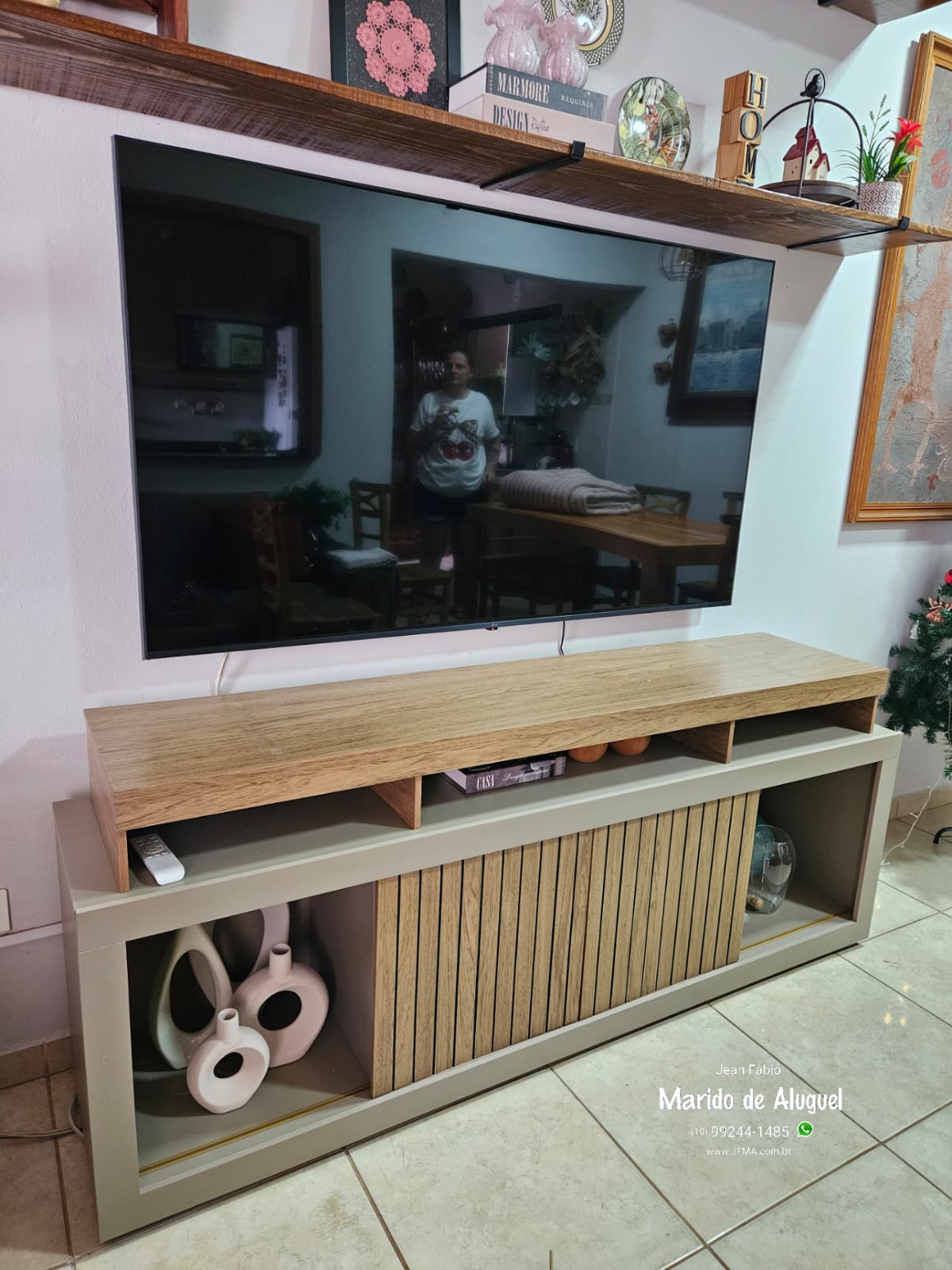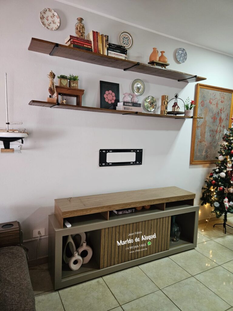 No final, a TV ficou bem posicionada entre o rack e as prateleiras, deixando a sala mais organizada, com um visual bonito e moderno, além de trazer mais conforto para assistir. 📺🔧