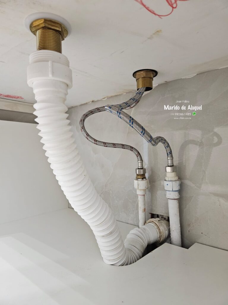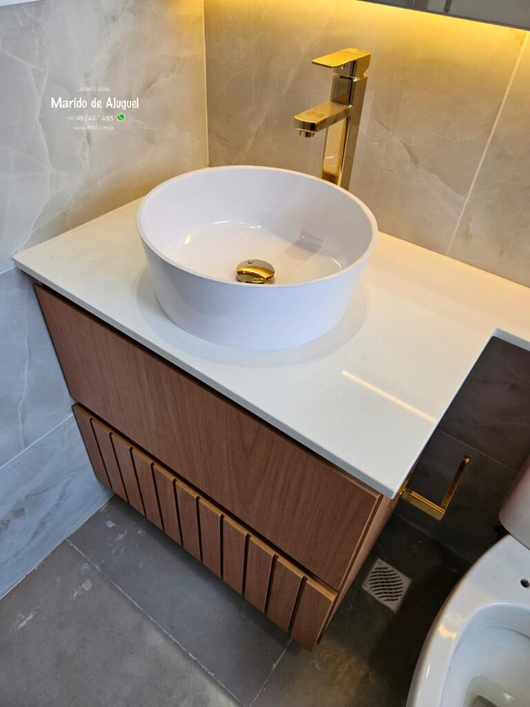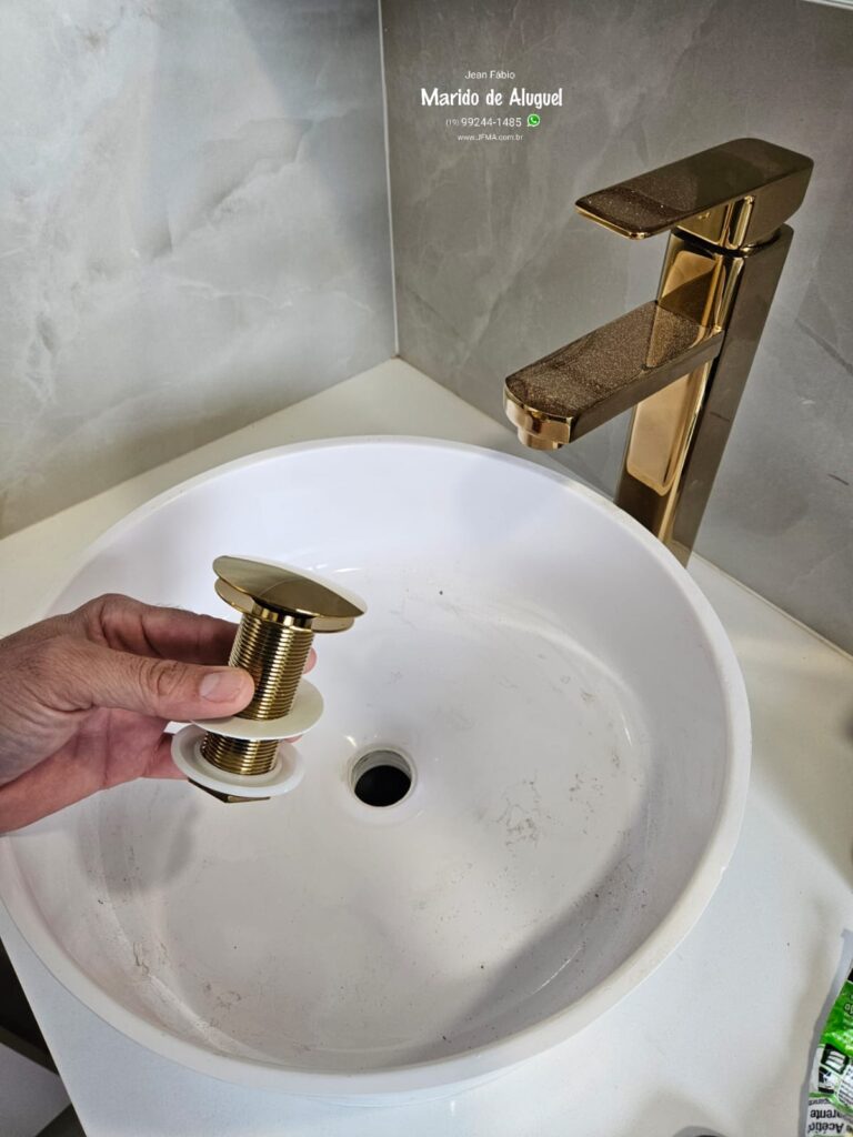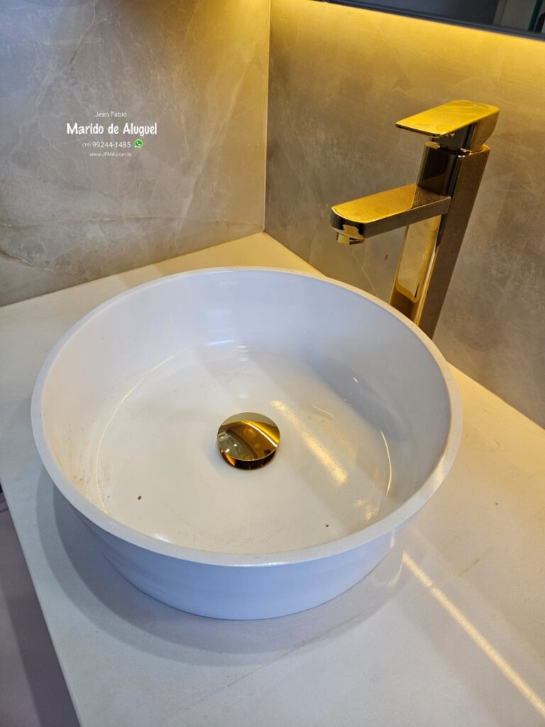 Comecei fazendo a instalação da torneira dourada na cuba, garantindo uma fixação firme e vedação correta pra evitar qualquer tipo de vazamento.