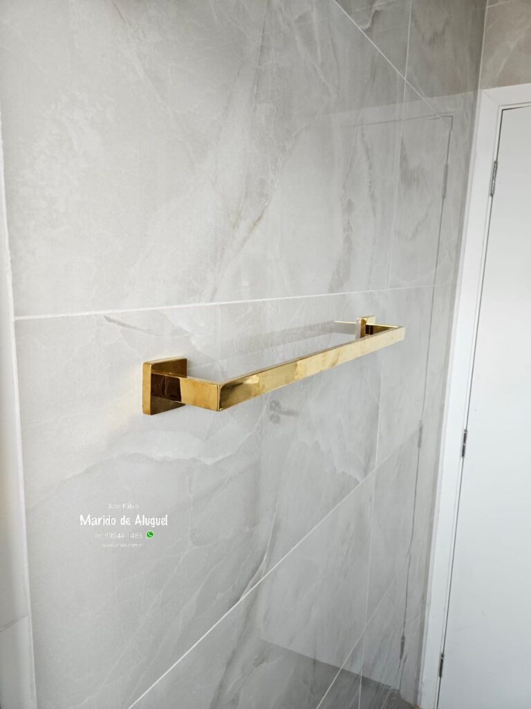 E pra completar, fiz a instalação do kit completo de ferragens do banheiro, tudo na cor dourada: porta toalha, saboneteira, porta shampoo e porta papel higiênico, todos bem alinhados e fixados com segurança.