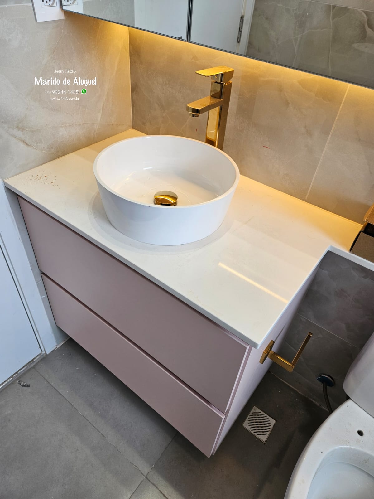 Comecei fazendo a instalação da torneira dourada na cuba, garantindo uma fixação firme e vedação correta pra evitar qualquer tipo de vazamento.