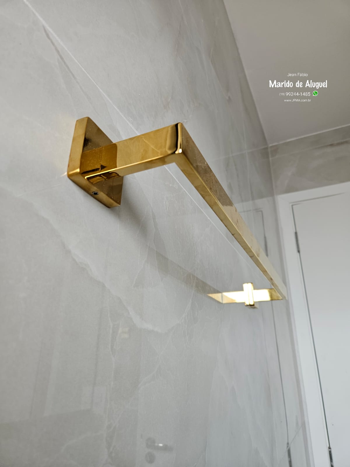 E pra completar, fiz a instalação do kit completo de ferragens do banheiro, tudo na cor dourada: porta toalha, saboneteira, porta shampoo e porta papel higiênico, todos bem alinhados e fixados com segurança.
