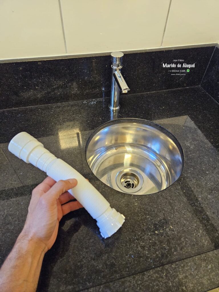 Comecei instalando a válvula na cuba, garantindo a vedação correta pra evitar qualquer tipo de vazamento. Em seguida, fiz a instalação do sifão, ajustando certinho pra deixar o escoamento da água funcionando perfeitamente e sem retorno de odor.