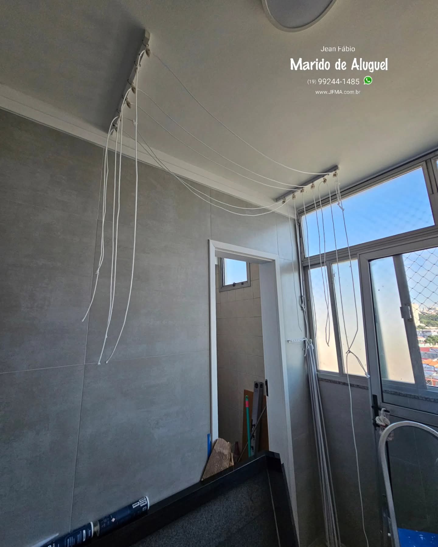 Nesse apartamento, fiz a instalação completa de um varal de teto com 6 varetas individuais. Comecei preparando o material, fixei os suportes na parede, passei as cordinhas e ajustei cada vareta na medida certa.