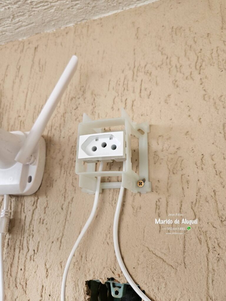 Encontrei uma fonte de luz próxima, puxei a fiação e instalei uma tomada de sobrepor para alimentar a câmera. Depois, fixei a câmera ao lado e fiz toda a configuração no celular da cliente.
