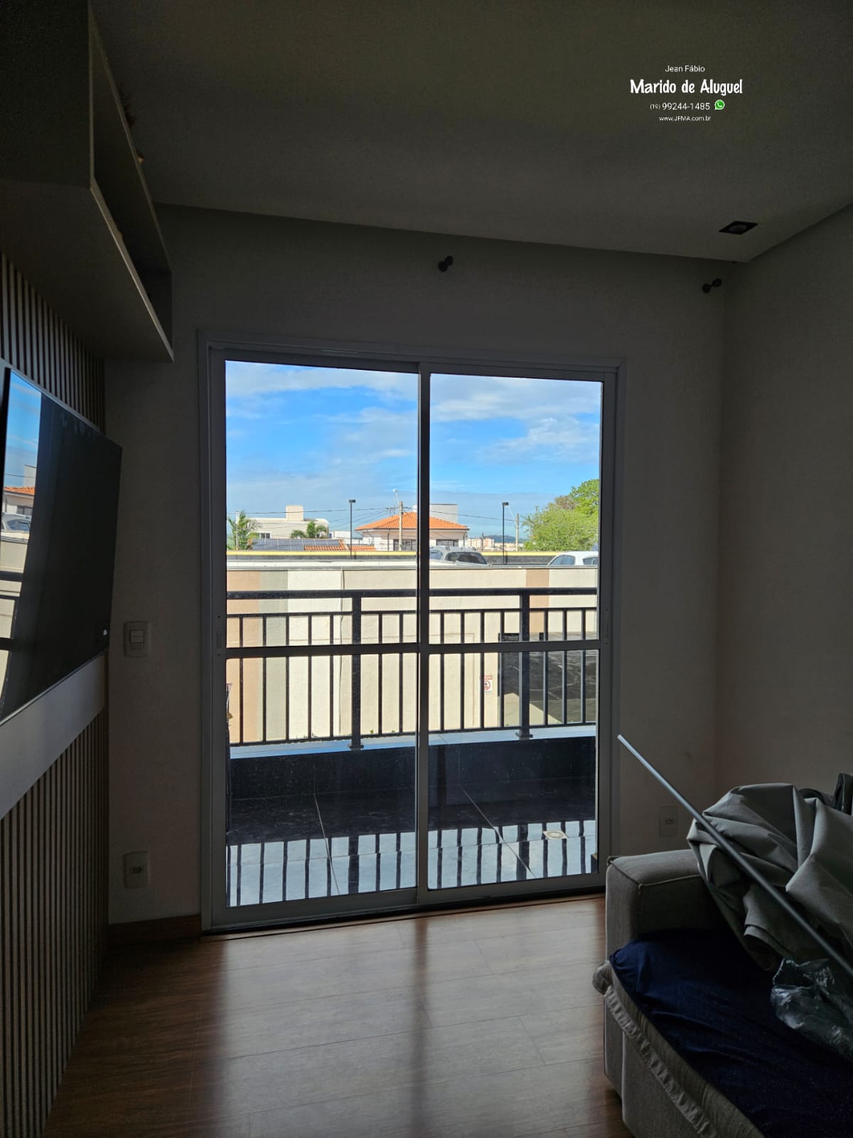 Nesse apartamento eu fiz a instalação de uma cortina blackout na sala, bem na porta que dá acesso à sacada.