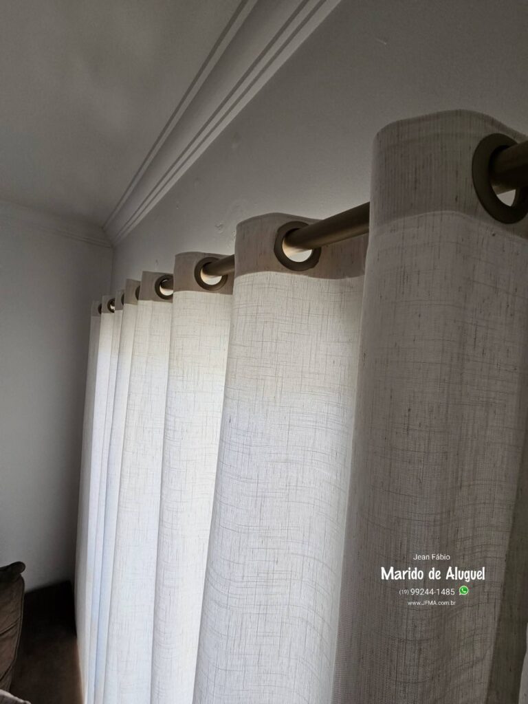 A cliente já tinha um varão em casa, mas o tamanho era muito maior do que o espaço da parede da sala. Para resolver, cortei o varão na medida exata e fiz a instalação da cortina de forma alinhada.