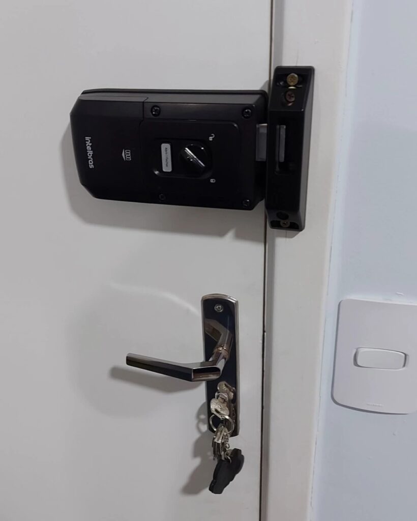 Comecei fazendo toda a marcação na porta, garantindo furação precisa e o alinhamento perfeito entre o corpo externo e o interno. Depois, fiz a fixação completa, configurei o painel digital e deixei tudo funcionando redondinho: acesso por senha, tranca automática e aviso sonoro.
