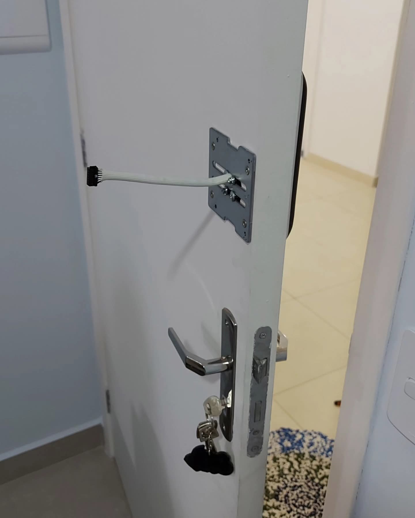 Comecei fazendo toda a marcação na porta, garantindo furação precisa e o alinhamento perfeito entre o corpo externo e o interno. Depois, fiz a fixação completa, configurei o painel digital e deixei tudo funcionando redondinho: acesso por senha, tranca automática e aviso sonoro.