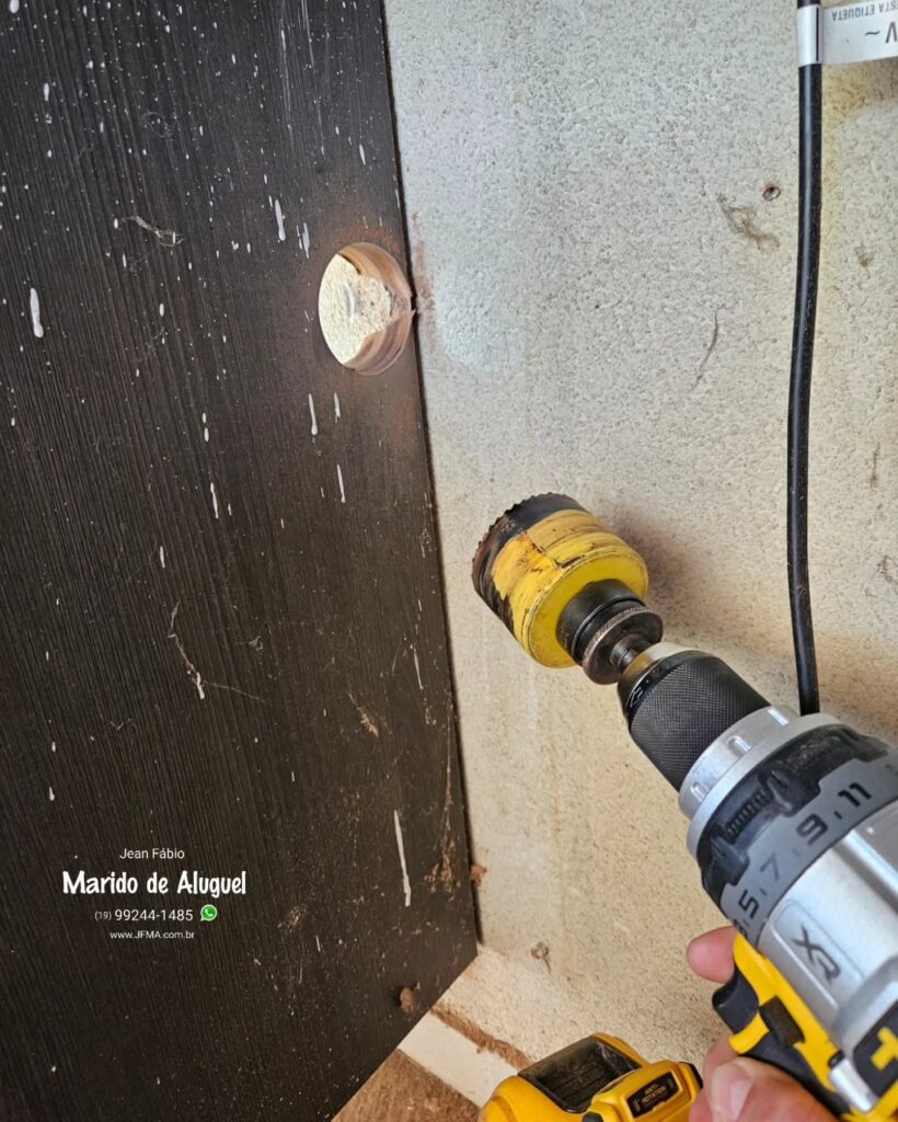 Para que tudo ficasse perfeito, precisei fazer um furo na madeira do gabinete com uma serra-copo, para dar passagem a magueira que liga até a tubulação de água, localizada abaixo do tanque.