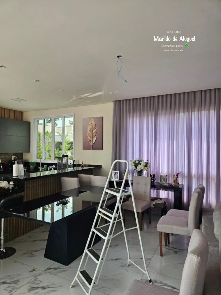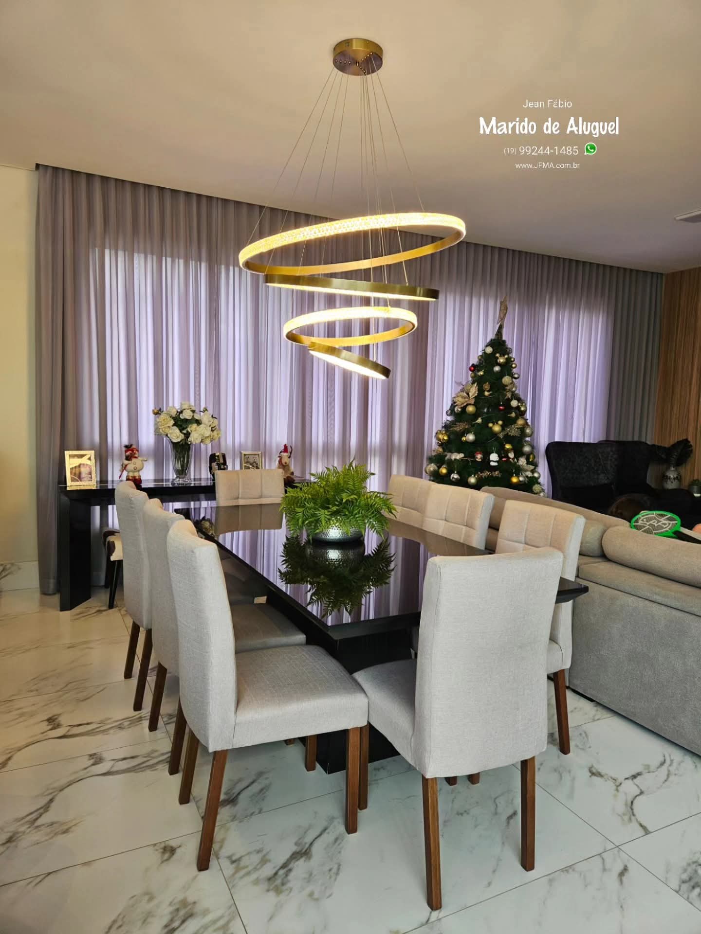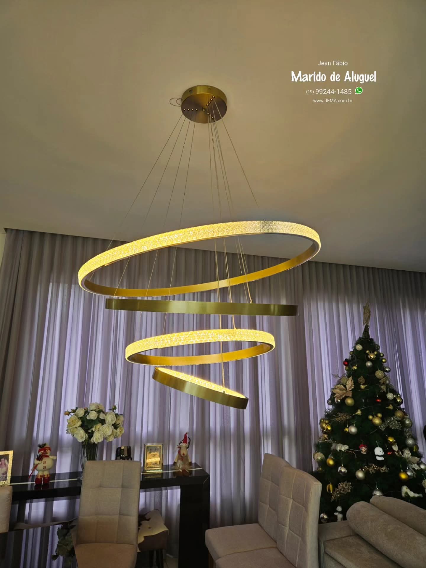 Nessa casa, o ambiente é um pouco mais fechado, então a escolha da iluminação fez toda a diferença. Instalei um lustre com três argolas grandes de LED — ele até parece pequeno olhando rápido, mas é um lustre grande e bem imponente, que valoriza muito o espaço. Fiz toda a instalação com cuidado, garantindo a fixação correta e o posicionamento ideal bem acima da mesa de jantar, deixando a iluminação equilibrada e destacando o ambiente como um todo.O resultado ficou muito bonito, trazendo mais elegância, modernidade e uma iluminação agradável para a sala de jantar.