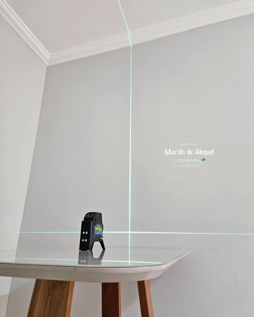 A cliente queria trocar a luminária da cozinha e instalar um pendente de LED que ficasse apontado exatamente no centro da mesa. Para garantir o alinhamento perfeito, posicionei a mesa no lugar que ela desejava, medi todo o espaço e usei o laser para marcar o ponto central no teto, com isso, garanti um alinhamento perfeito, e sem erro, bem no centro da mesa.