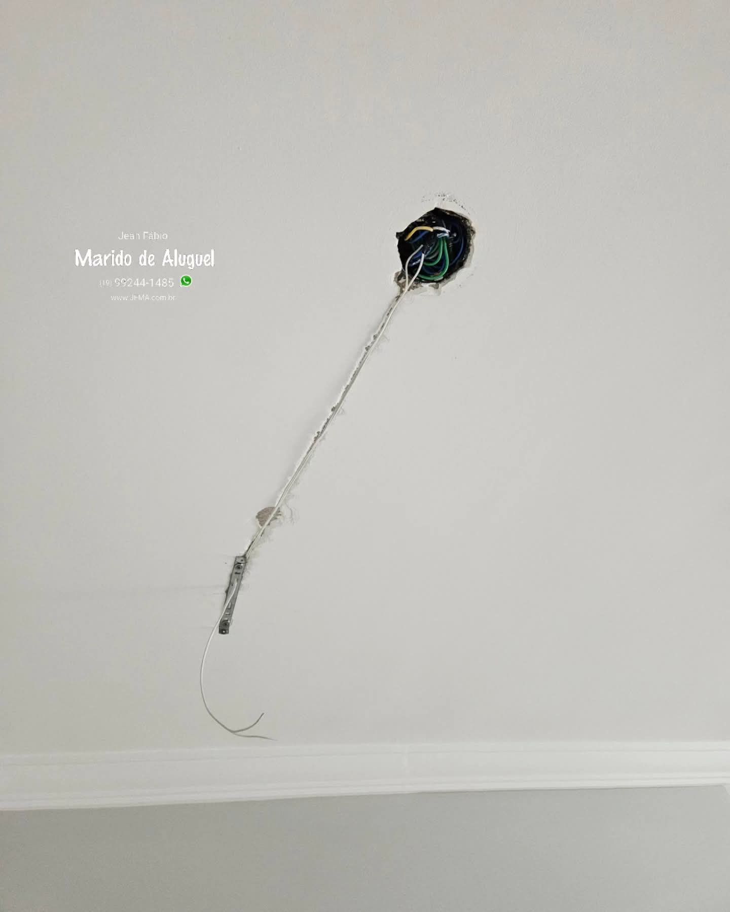 Em seguida, desloquei a alimentação elétrica até o novo ponto, abrindo o teto, passando o fio e depois realizando todo o tratamento: fechei com gesso, apliquei massa corrida e finalizei com a pintura para deixar tudo uniforme e sem marcas.