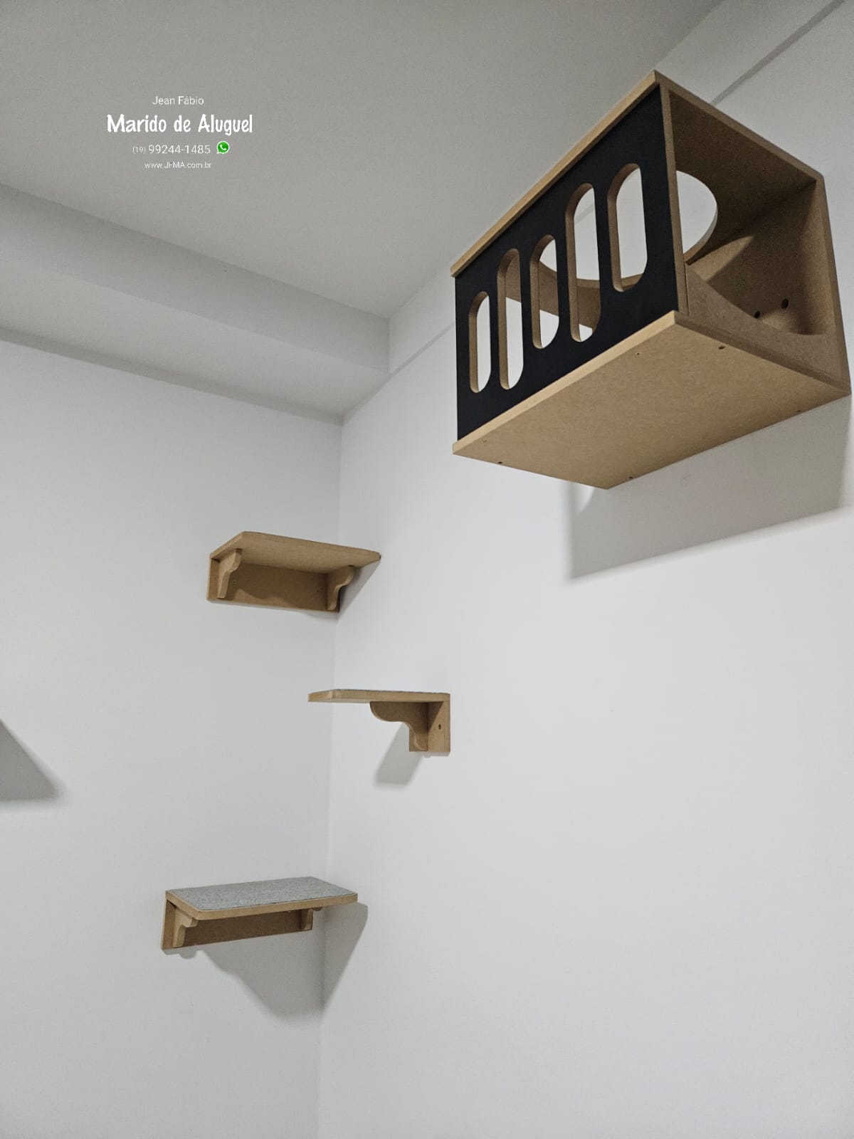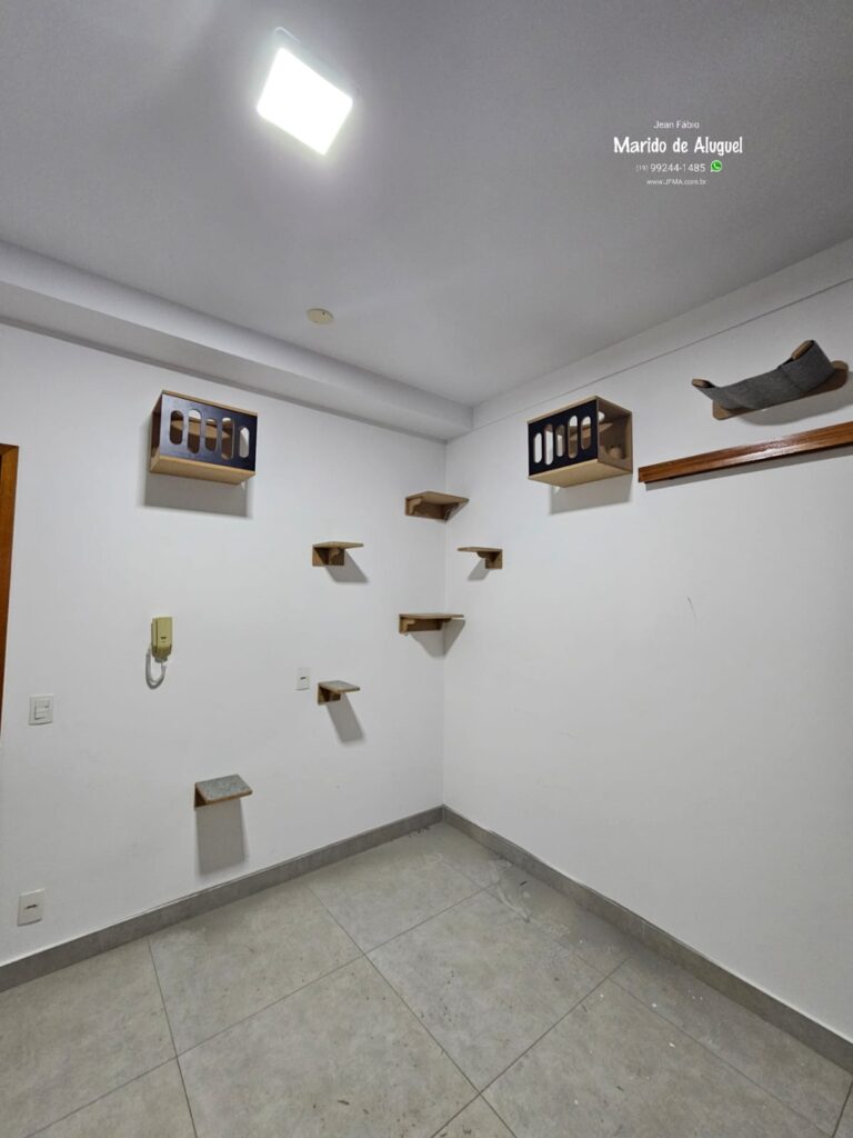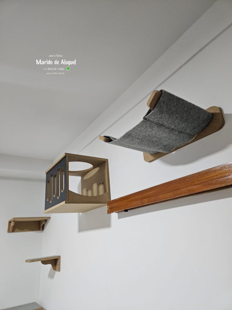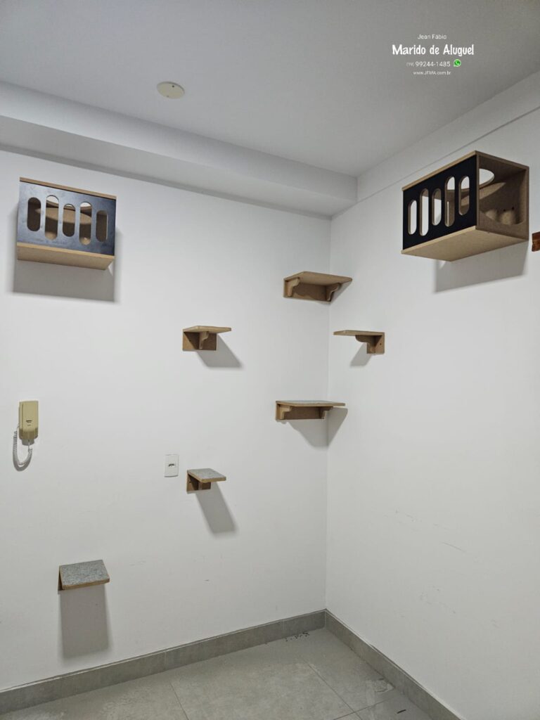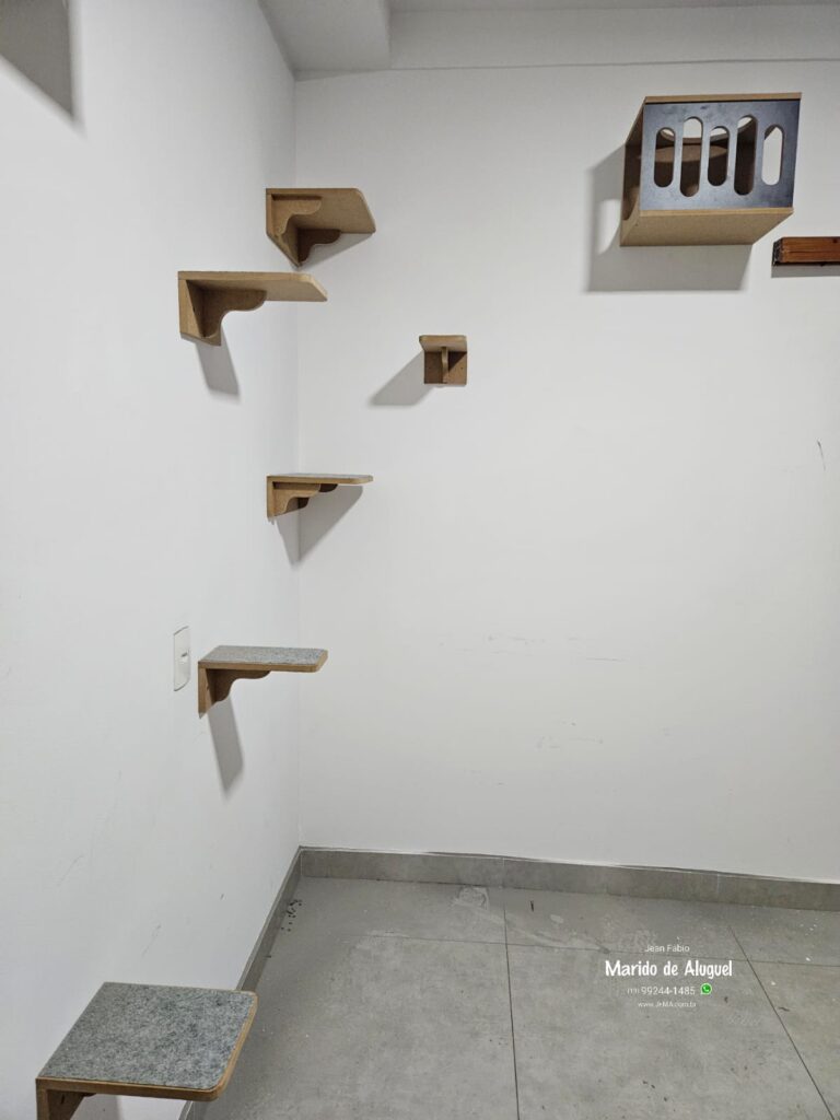 Nesse serviço, fiz a instalação de um playground completo para gato, com cerca de 8 a 10 peças fixadas na parede. O próprio cliente já tinha idealizado o formato que queria, e eu executei tudo conforme o planejamento dele, respeitando as alturas, distâncias e segurança de cada parte.