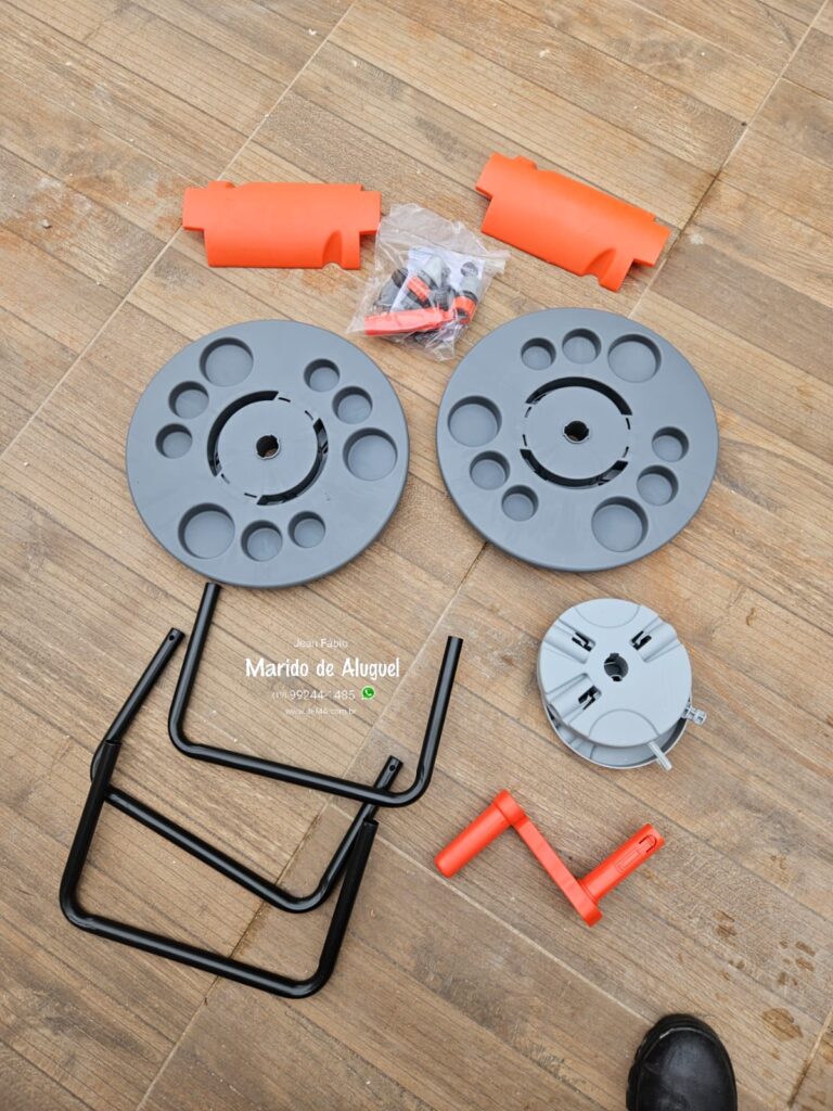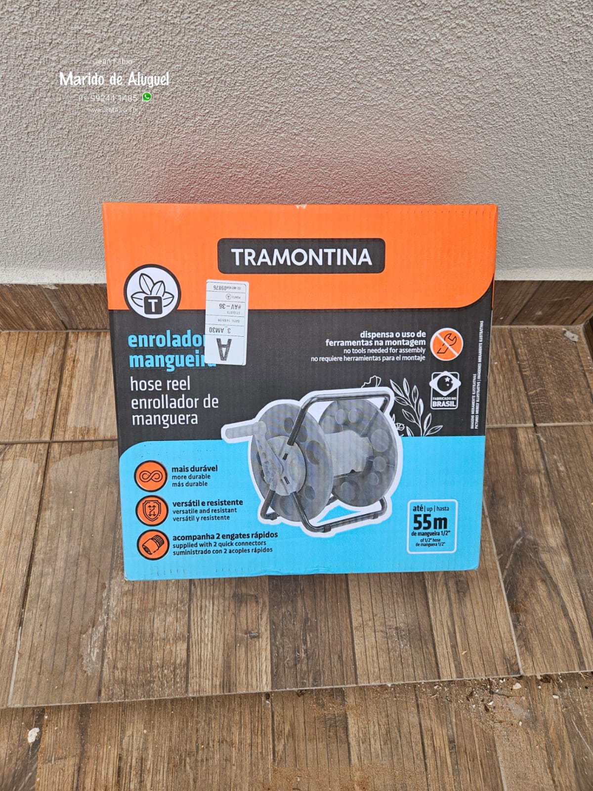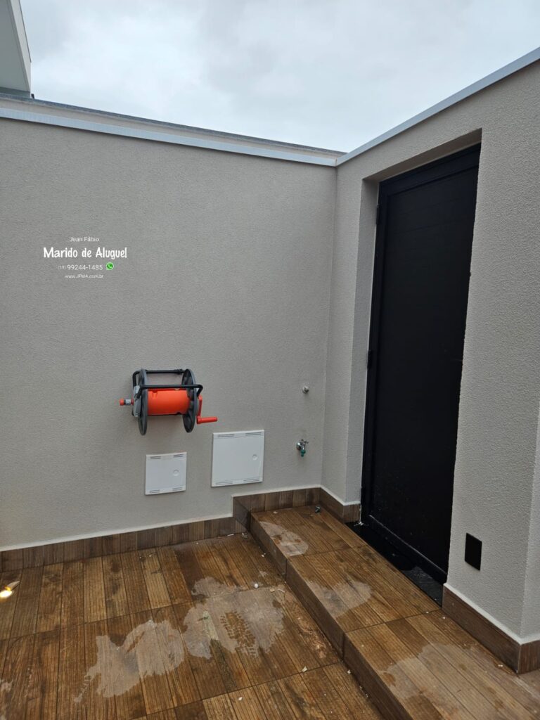 Na parte da frente, fiz a montagem e instalação de um porta mangueira da Tramontina. Esse modelo é bem prático: depois de fixado na parede, ele permite girar a manivela, facilitando na hora de enrolar a mangueira e mantendo tudo bem organizado.
