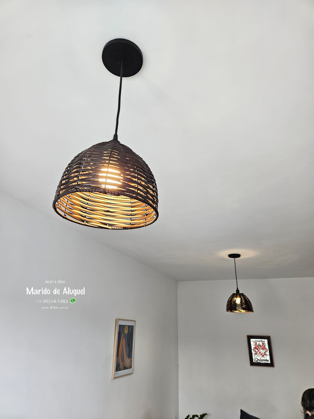 Nesse serviço, fiz a instalação de um quadro decorativo na sala e também a colocação de dois pendentes rústicos, posicionados um em cada canto do ambiente para valorizar ainda mais a iluminação e a decoração do espaço.Primeiro realizei a fixação do quadro, medindo e alinhando certinho para que ficasse bem centralizado e nivelado na parede, garantindo um acabamento bonito e seguro. Depois parti para a instalação dos dois pendentes rústicos. Fiz toda a fixação e ligação elétrica com cuidado, deixando cada um bem posicionado nos cantos da sala para criar uma iluminação mais distribuída e harmoniosa. Para dar um toque ainda mais aconchegante, utilizamos lâmpadas de luz amarela, que deixam o ambiente mais acolhedor e elegante. No final, a sala ganhou uma iluminação muito bonita e uma decoração ainda mais valorizada. Tudo instalado com segurança, capricho e atenção aos detalhes.