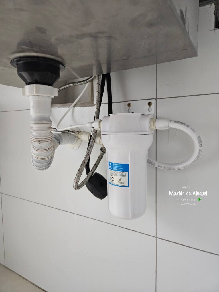 Iniciei instalando a torneira e em seguida, abaixo dela escondidinho dentro dos armários, instalei o filtro.