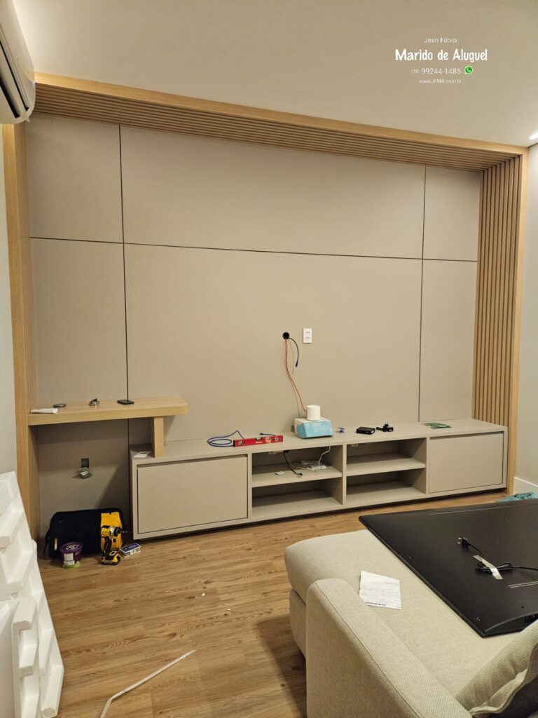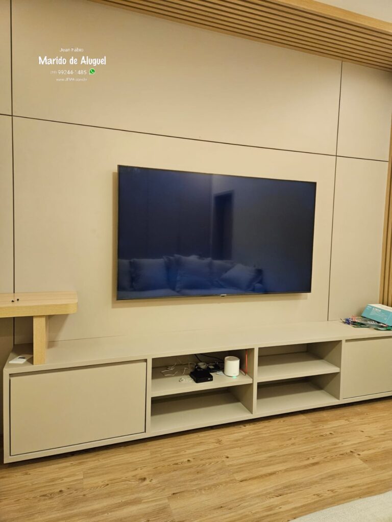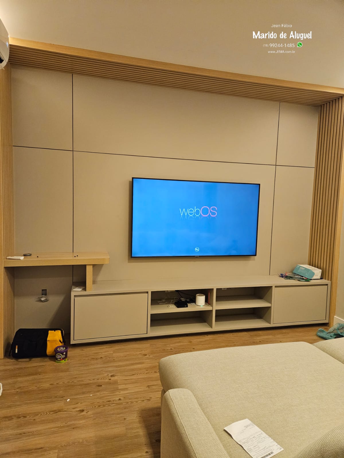Fui chamado para realizar a instalação de uma TV de 55 polegadas em um painel de madeira.