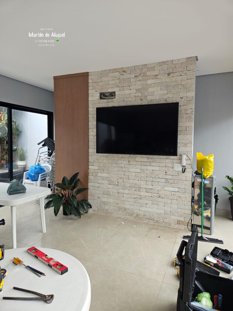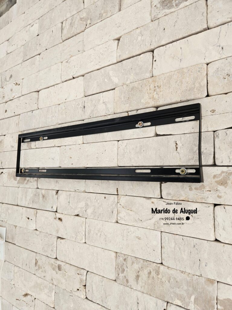 Antes de tudo, analisei a parede e indiquei o suporte ideal pra esse tipo de instalação, pensando principalmente na segurança, já que é uma TV grande e precisa ficar bem firme. Após a escolha correta do suporte, fiz toda a fixação com muito cuidado, garantindo que ficasse bem nivelada e resistente.