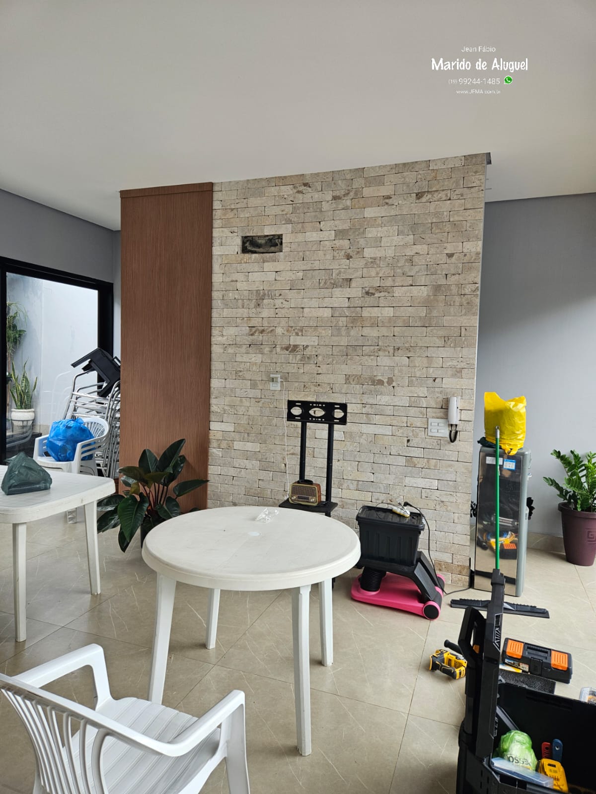 Aqui o cliente queria dar um upgrade na área de lazer, bem na parte da churrasqueira, e optou por instalar uma TV de 75 polegadas pra curtir ainda mais o espaço com a família e os amigos.