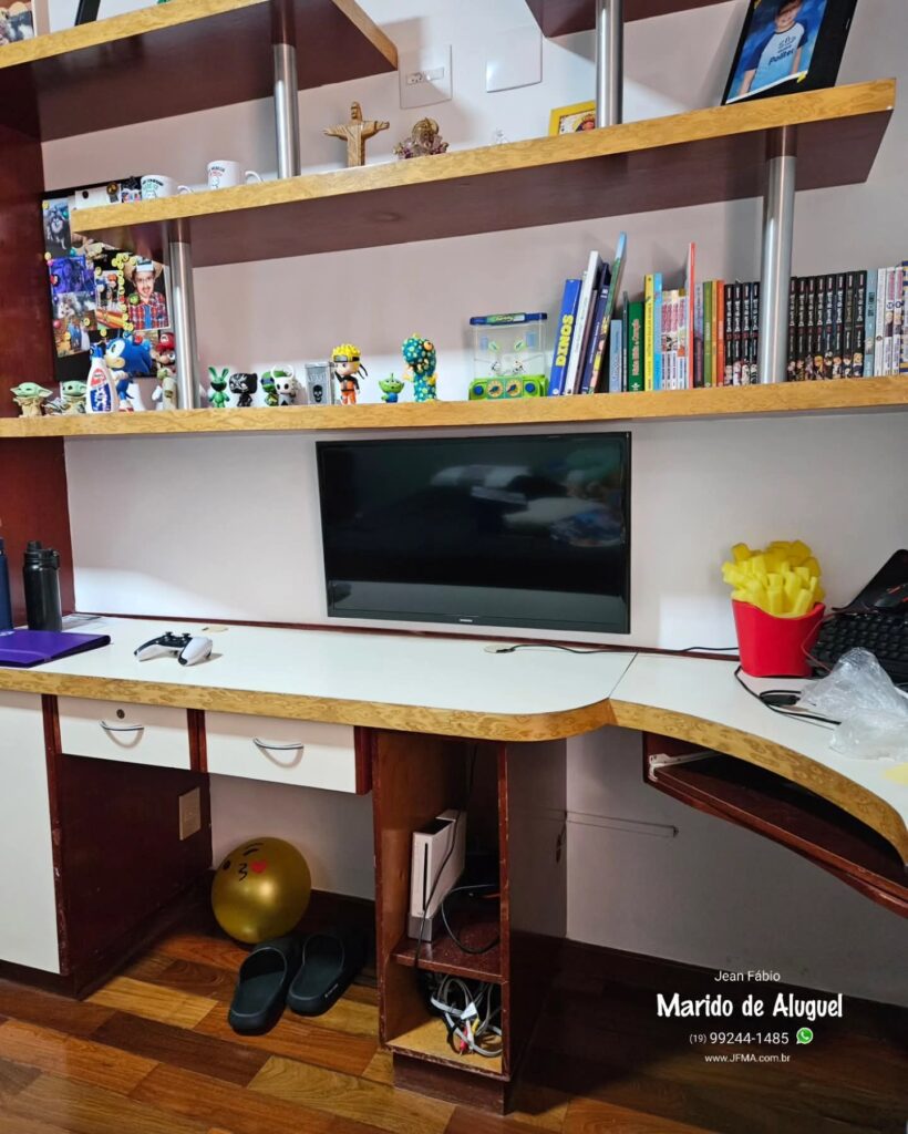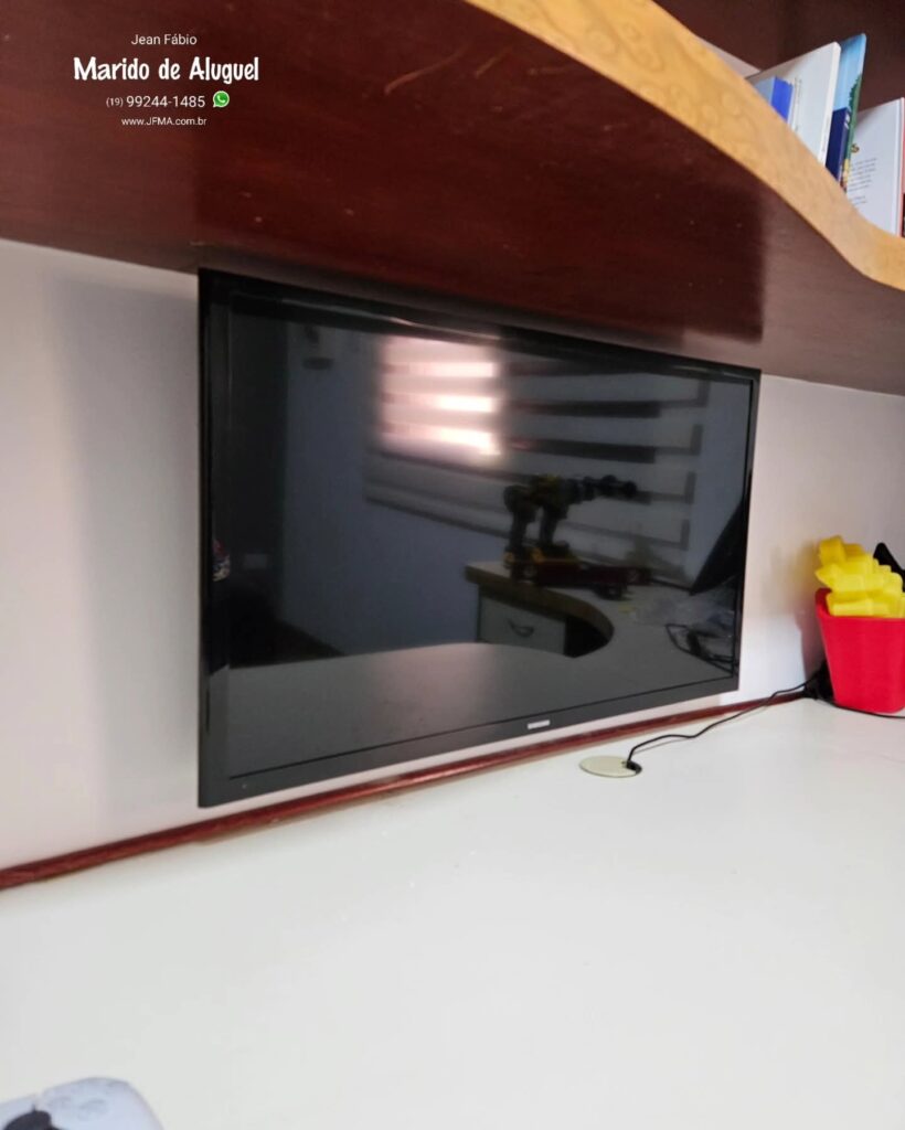 Nesse apartamento, o cliente queria instalar a TV bem no centro do móvel do quarto. O espaço era apertado, mas com cuidado e medidas precisas, consegui fazer a fixação direitinho e até da a impressão de que o móvel foi feito com a medida para encaixar a Tv ali!