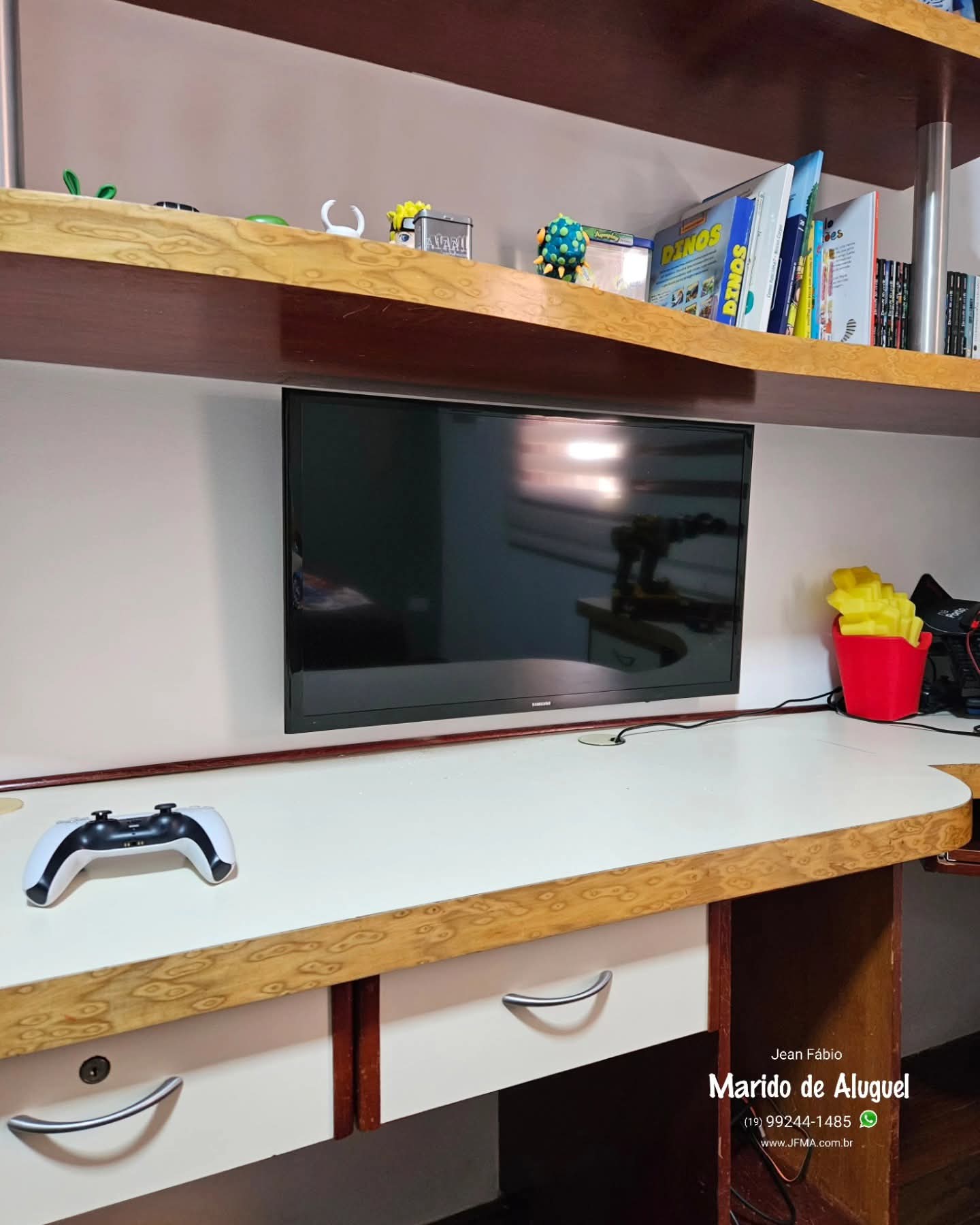 Nesse apartamento, o cliente queria instalar a TV bem no centro do móvel do quarto. O espaço era apertado, mas com cuidado e medidas precisas, consegui fazer a fixação direitinho e até da a impressão de que o móvel foi feito com a medida para encaixar a Tv ali!