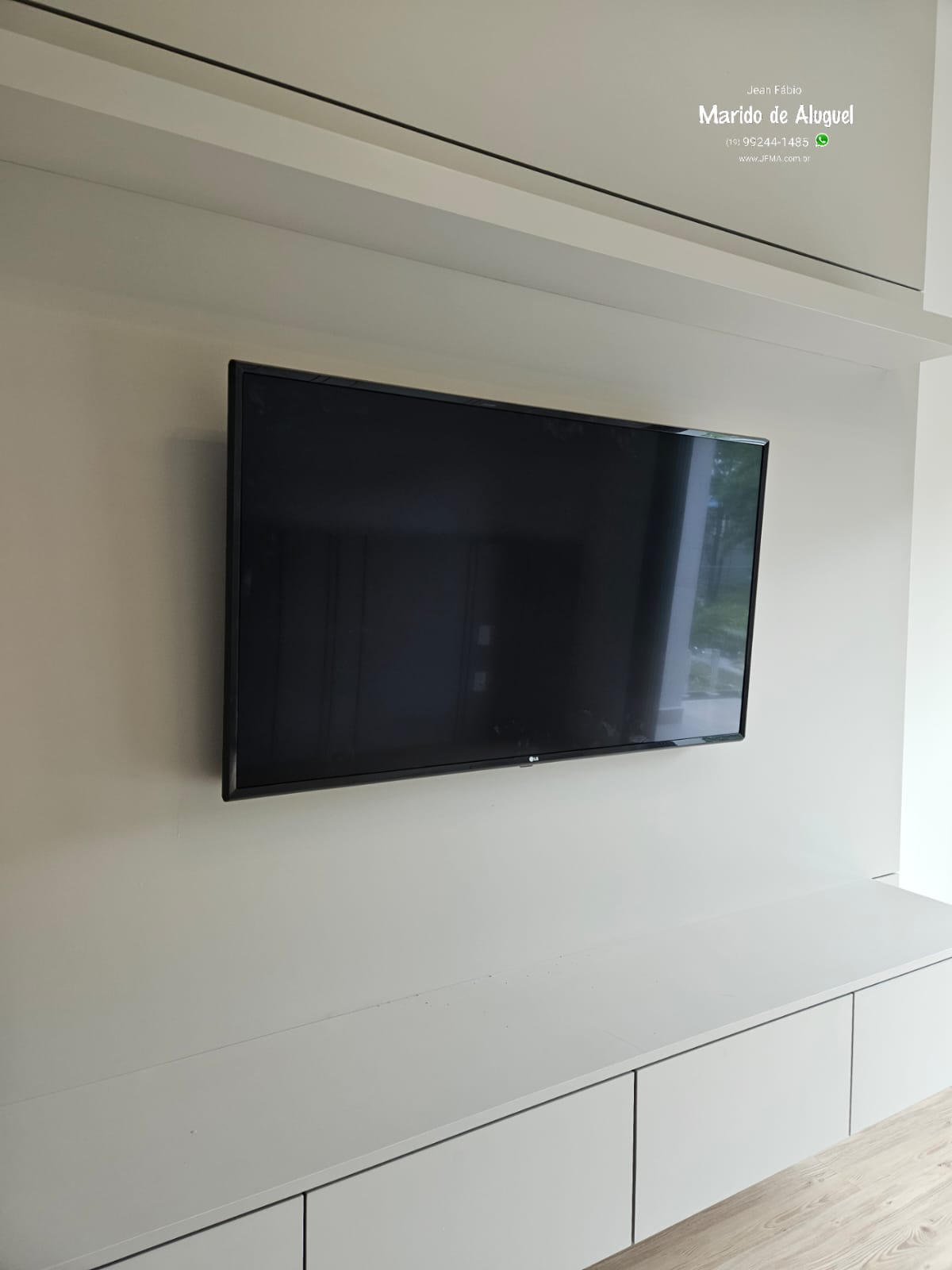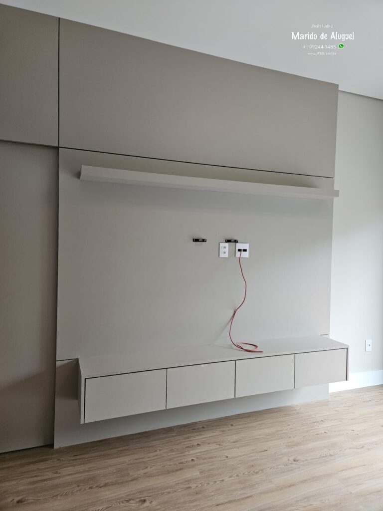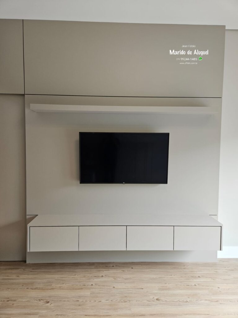 Nesse quarto, fiz a instalação de uma TV de 55 polegadas em um painel de madeira, deixando ela bem fixa, alinhada e segura.