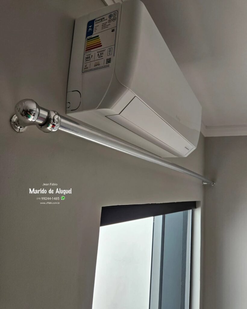 Fui chamado pra instalar um varão de cortina nessa casa, porém a cliente ainda não tinha comprado a cortina. Ela pediu apenas uma coisa: que eu colocasse o varão o mais alto possível, pra valorizar o ambiente. O detalhe é que acima da janela tem uma máquina de ar-condicionado, então havia um limite para subir. Analisei o espaço, respeitei a altura do ar pra não atrapalhar o funcionamento e instalei o varão um pouquinho abaixo do equipamento, aproveitando o máximo de altura disponível. Expliquei pra cliente que, quando ela comprasse a cortina, caso ficasse encostando ou sobrando no chão, seria só ajustar depois com a costureira. Pra ela, o mais importante era deixar o varão bem alto agora, e a cortina seria resolvida posteriormente. Varão instalado com firmeza, bem alinhado e na melhor posição possível.