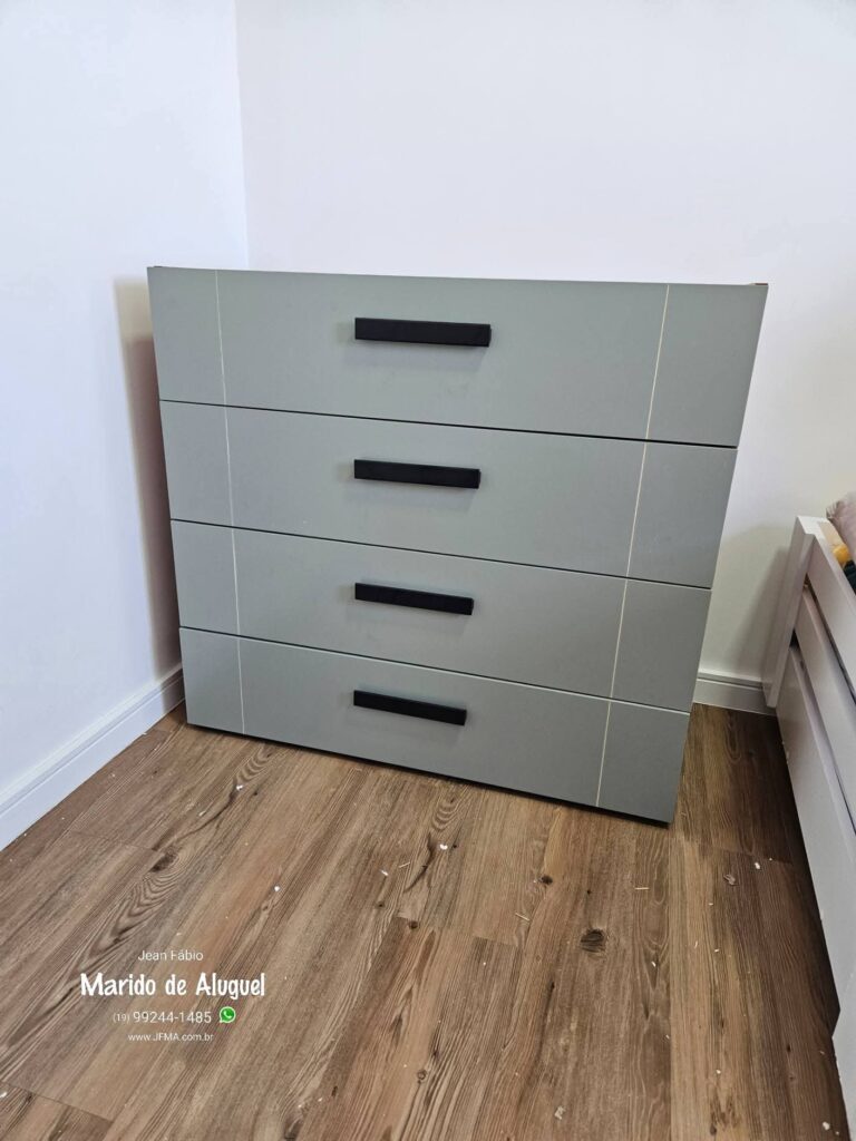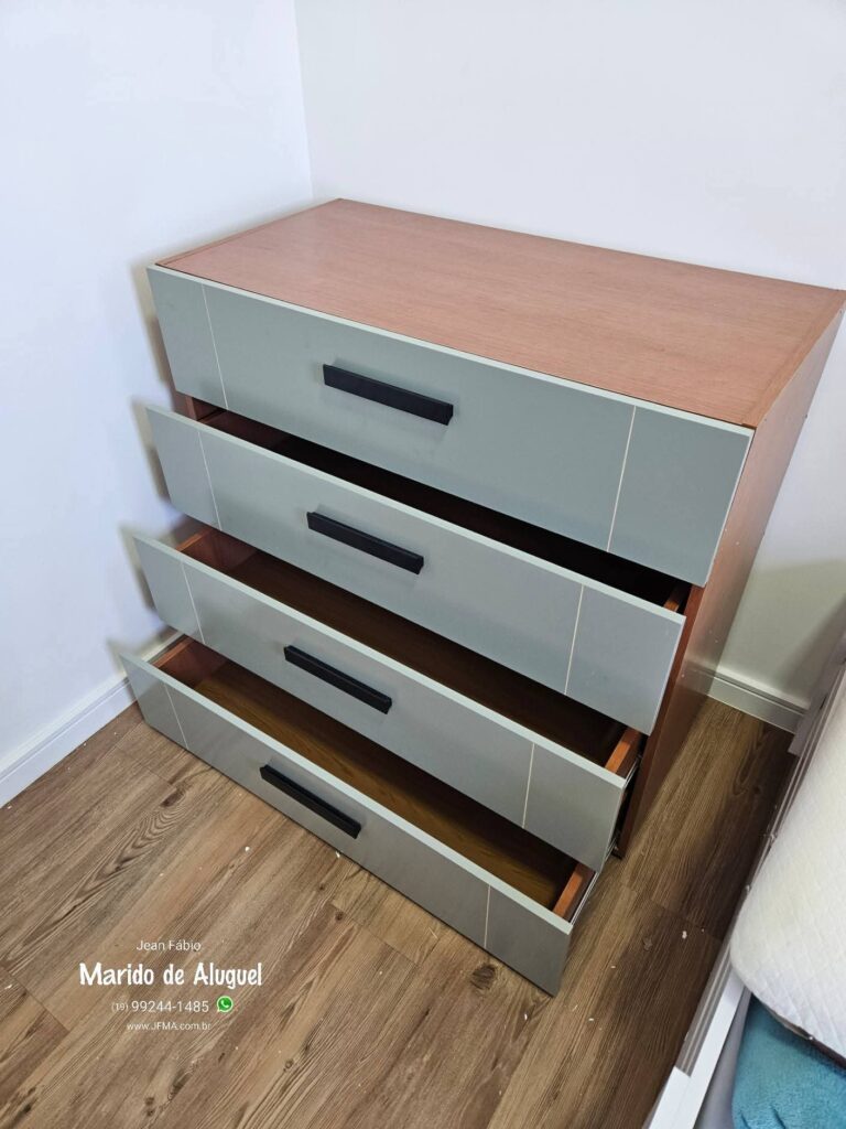 Nesse quarto infantil montei uma cômoda de 4 gavetas, deixando cada encaixe bem firme e as corrediças alinhadas para abrir e fechar com facilidade.