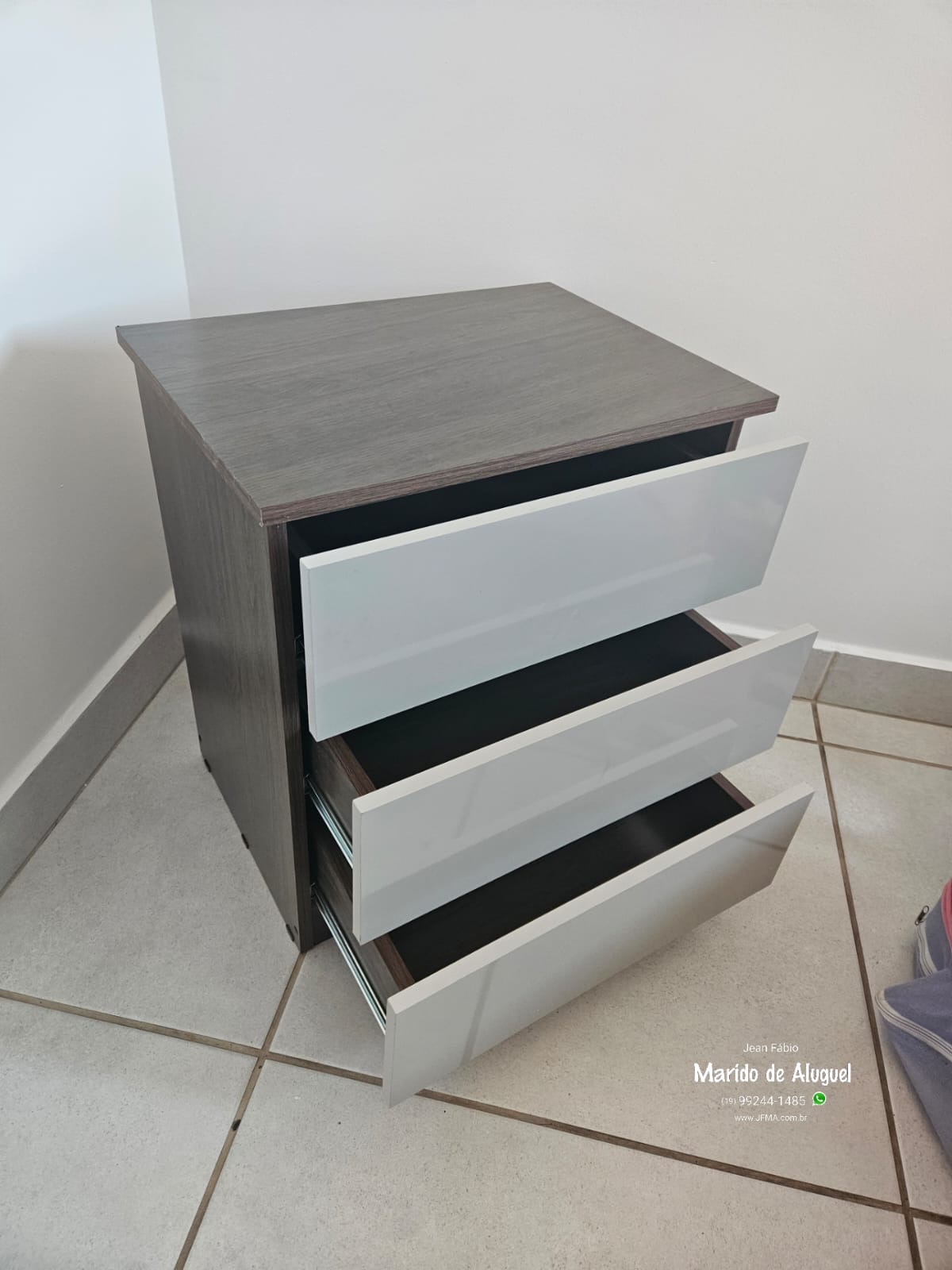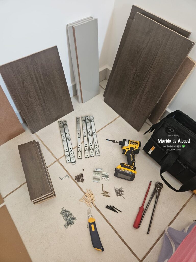 Depois, instalei as gavetas e fiz todos os ajustes necessários, garantindo que abrissem e fechassem suavemente, sem enroscar. Finalizei com o alinhamento geral do criado-mudo, deixando tudo nivelado e bem encaixado.