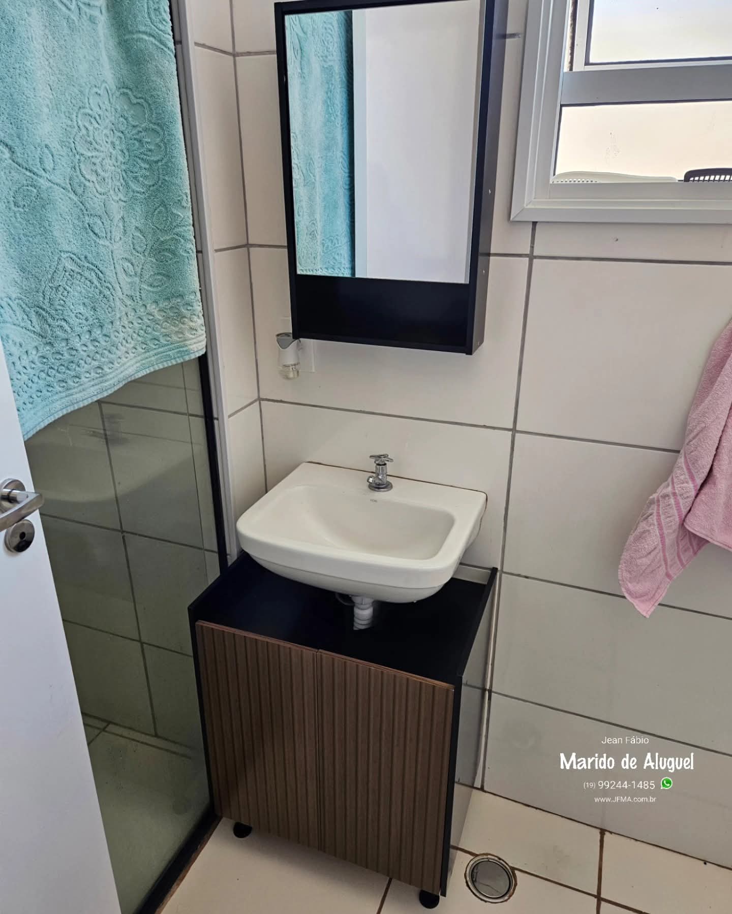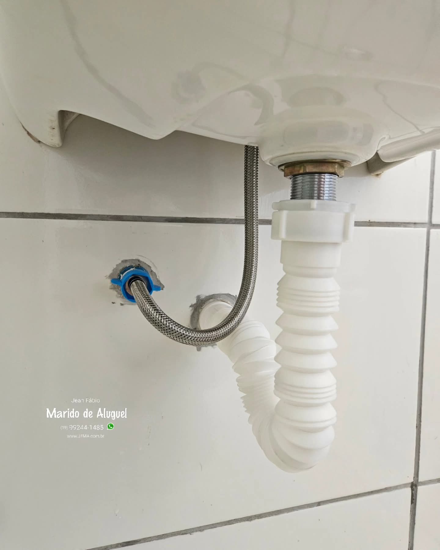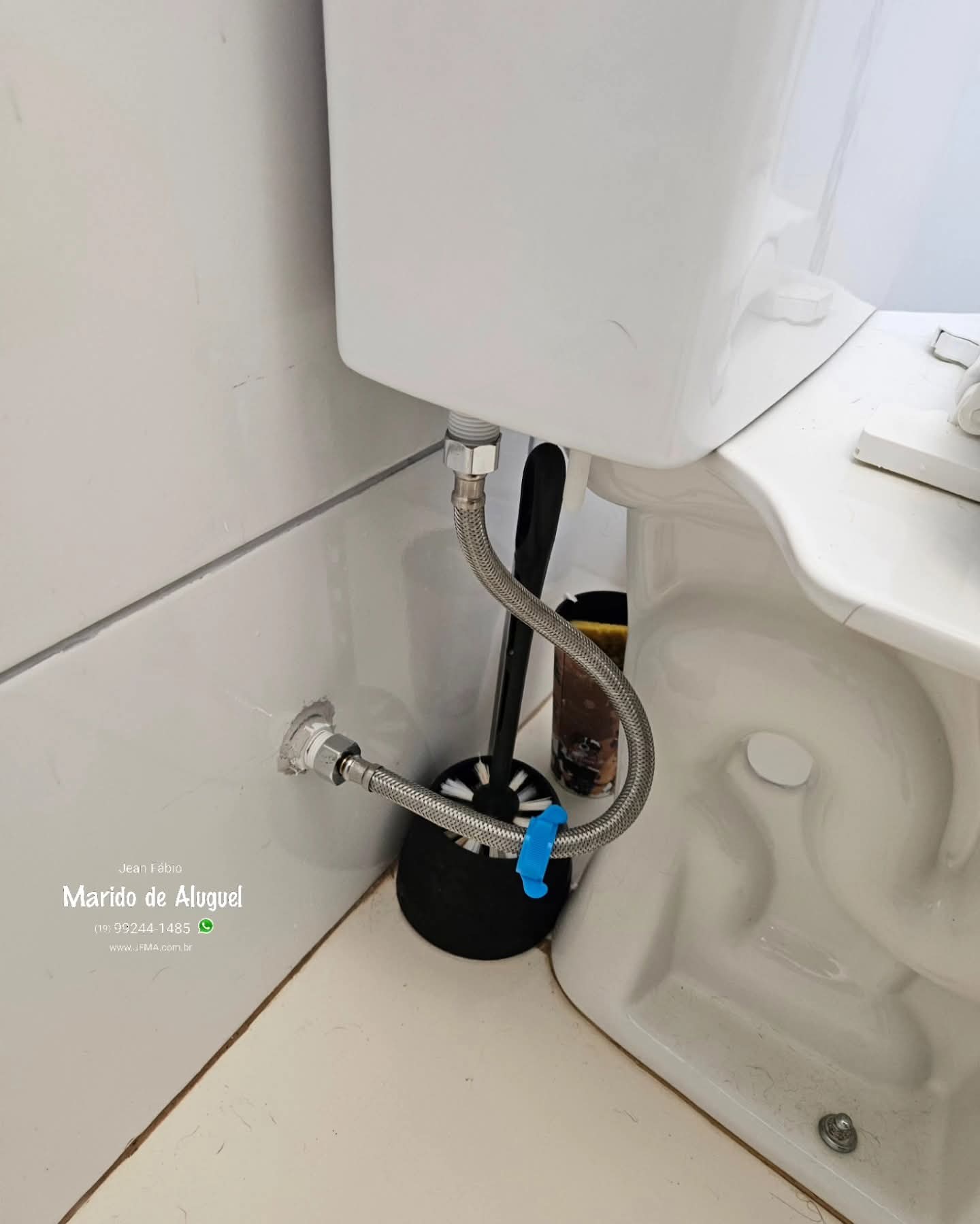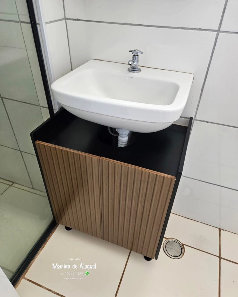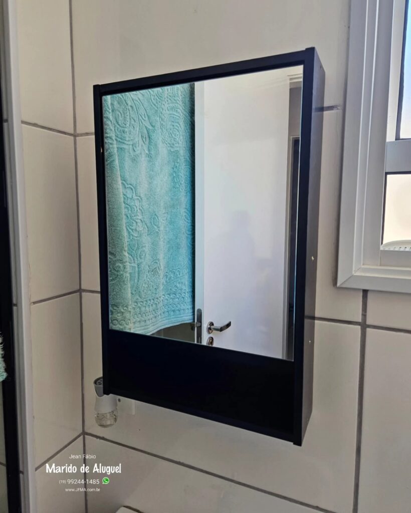 Nesse banheiro, fiz a montagem de um móvel (armário) preto debaixo da pia. É um móvel prático, que pode ser retirado e colocado sempre que precisar, pois não fica fixado na parede.Também fiz a fixação do armário de espelho, que já vem montado de fábrica. Marquei, nivelei e fixei na parede com cuidado, garantindo alinhamento. Durante o serviço, identifiquei vazamento na pia, então fiz a troca do engate de água e do sifão, resolvendo o problema. No vaso sanitário, o engate (a mangueirinha que liga a caixa acoplada à entrada de água) estava quebrado e com vazamento. Fiz a substituição por um novo, deixando tudo funcionando certinho e sem desperdício.