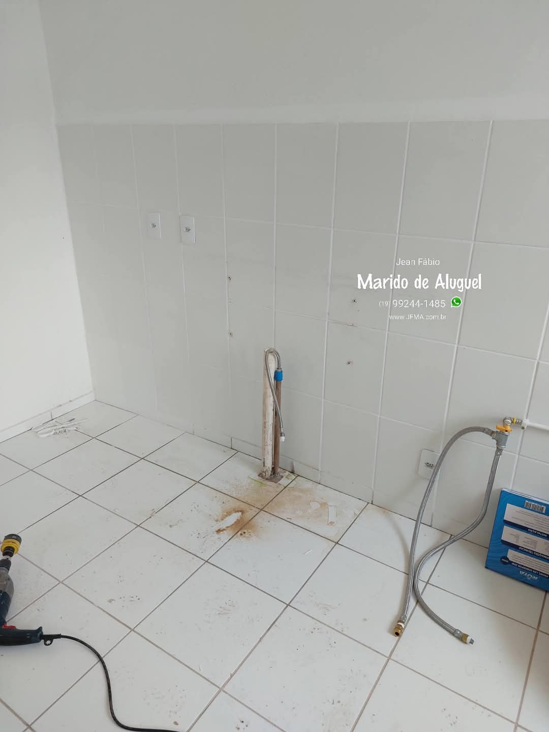 Montamos o gabinete, medimos tudo, e nele foi necessário fazer uns ajustes na madeira para a passagem do cano de água e esgoto que vinham do chão, e não da parede como.é o mais comum de ser. Com ele no lugar, recolocamos a pia, porém agora apoiada sobre ele, e instalamos a torneira, válvula (ralo), e o sifão… por fim, fizemos a vedação com silicone entre a parede e a pia, para evitar vazamentos e infiltrações.