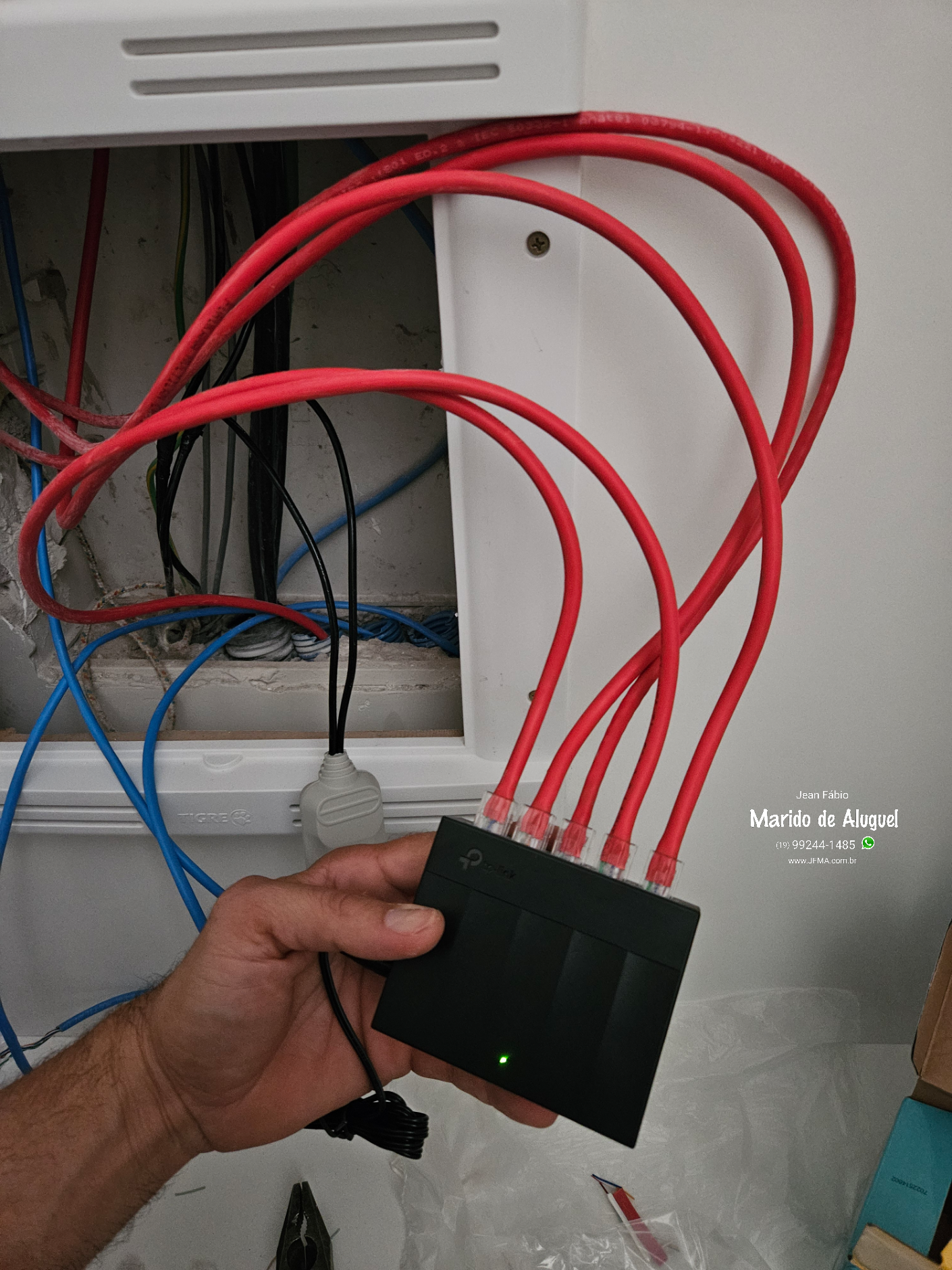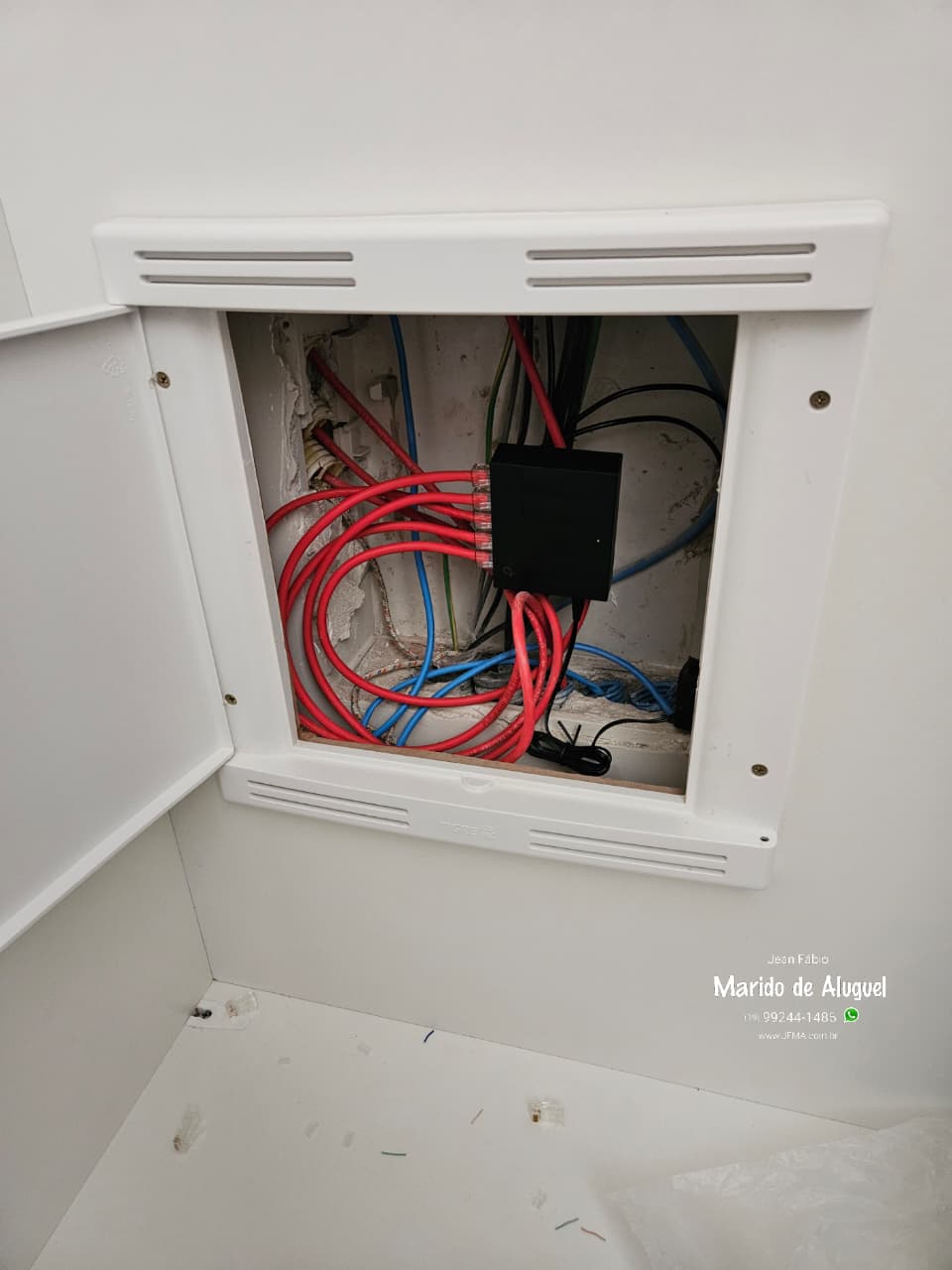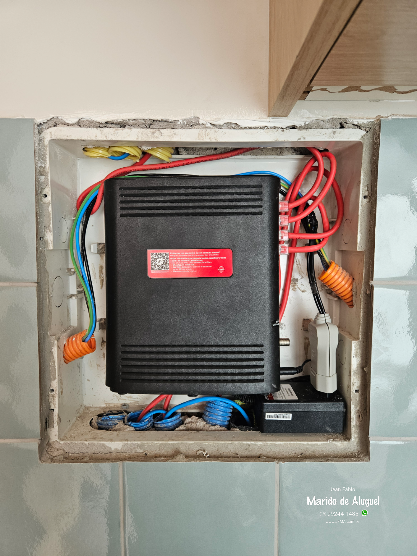 Nesse serviço, com os cabos ja devidamente passados nos conduites, organizei e crimpei os conectores rj45 em toda a rede de internet cabeada de um sobrado. No pavimento térreo, instalei o modem dentro da caixa de passagem. Para isso, precisei instalar uma tomada exclusiva para alimentar o equipamento.