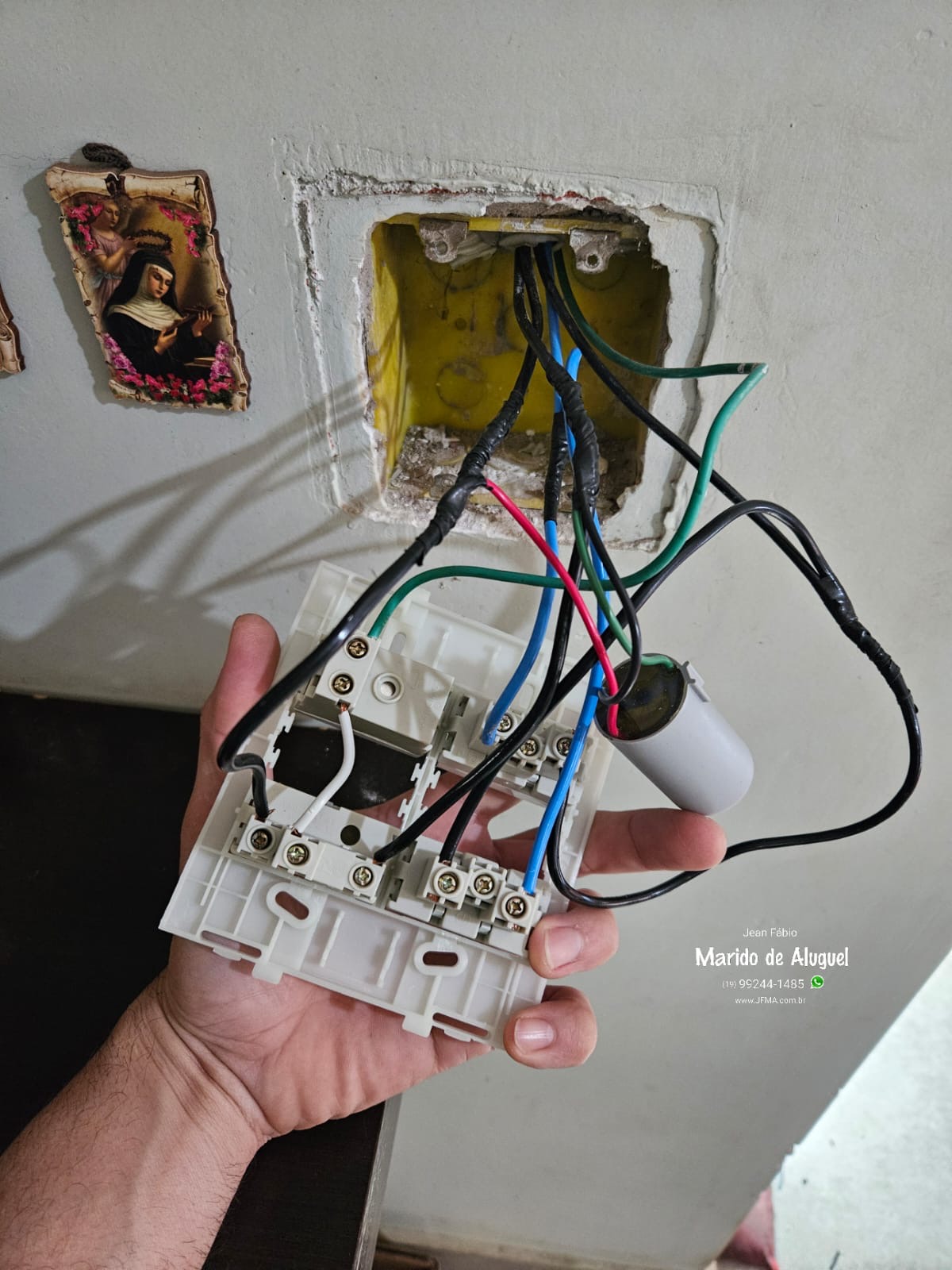 Nessa casa o ventilador já estava instalado, mas a caixinha onde ficava o comando estava toda danificada… fios bagunçados, estrutura quebrada e nada funcionando do jeito certo.