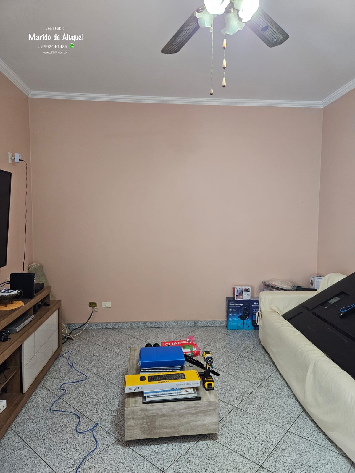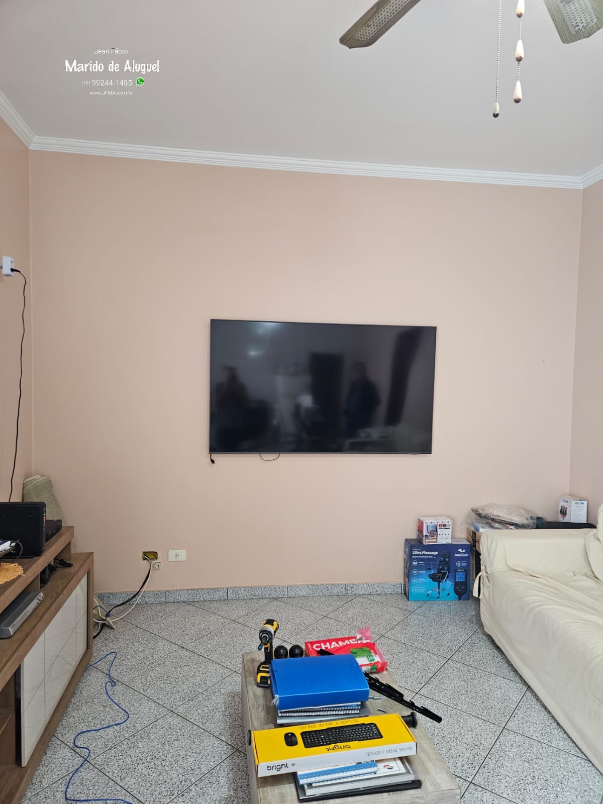 Com isso, ele quis levar a TV para outra parede, pra acompanhar melhor a nova posição do sofá e deixar a visualização mais confortável.