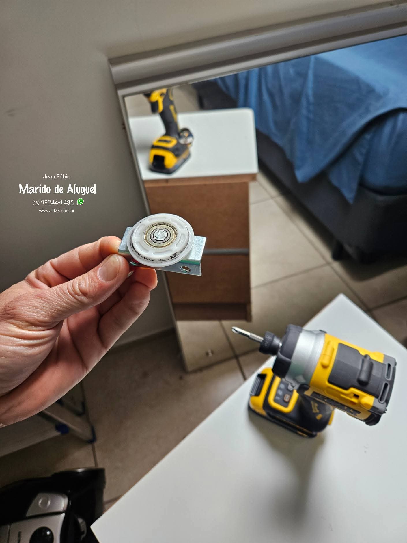 O cliente me chamou porque a porta de correr do guarda-roupa do corredor tinha soltado. Fui até a casa para verificar e percebi que nada estava quebrado, apenas a rodinha tinha se soltado. Aproveitei as mesmas rodinhas, parafusei novamente e fiz a reinstalação da porta, desta vez com reforço para evitar que o problema se repita.