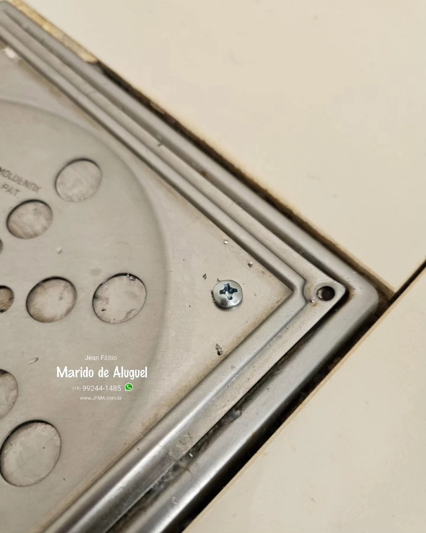 Fui até a casa da cliente para resolver um problema no ralo do banheiro. Ele é totalmente de inox, e não estava quebrado. Mas o parafuso qur segura a tampa oxidou e acabou quebrando, fazendo que a mesma ficasse solta.