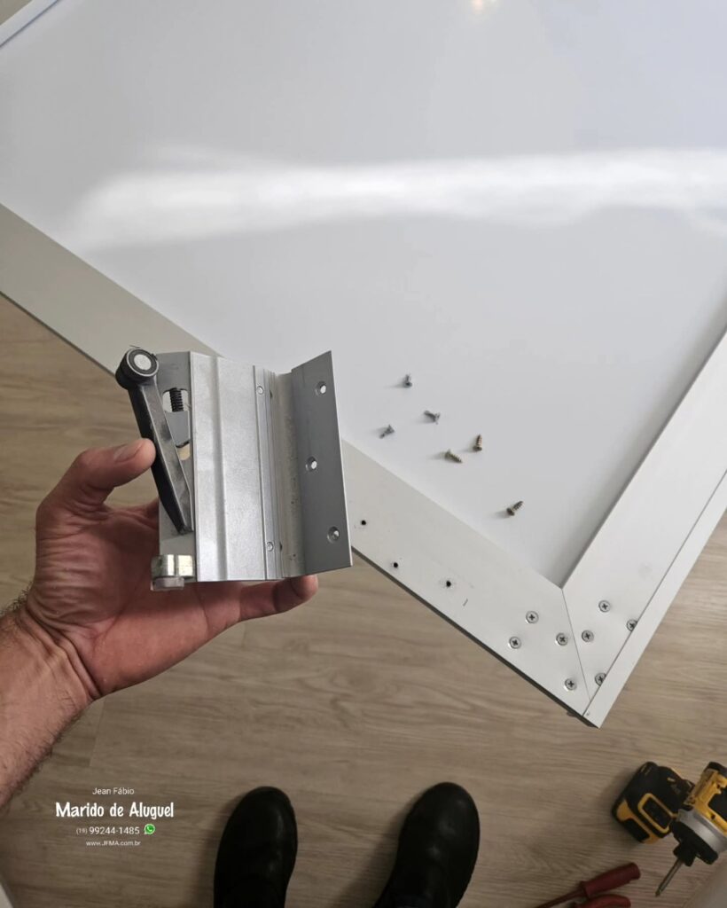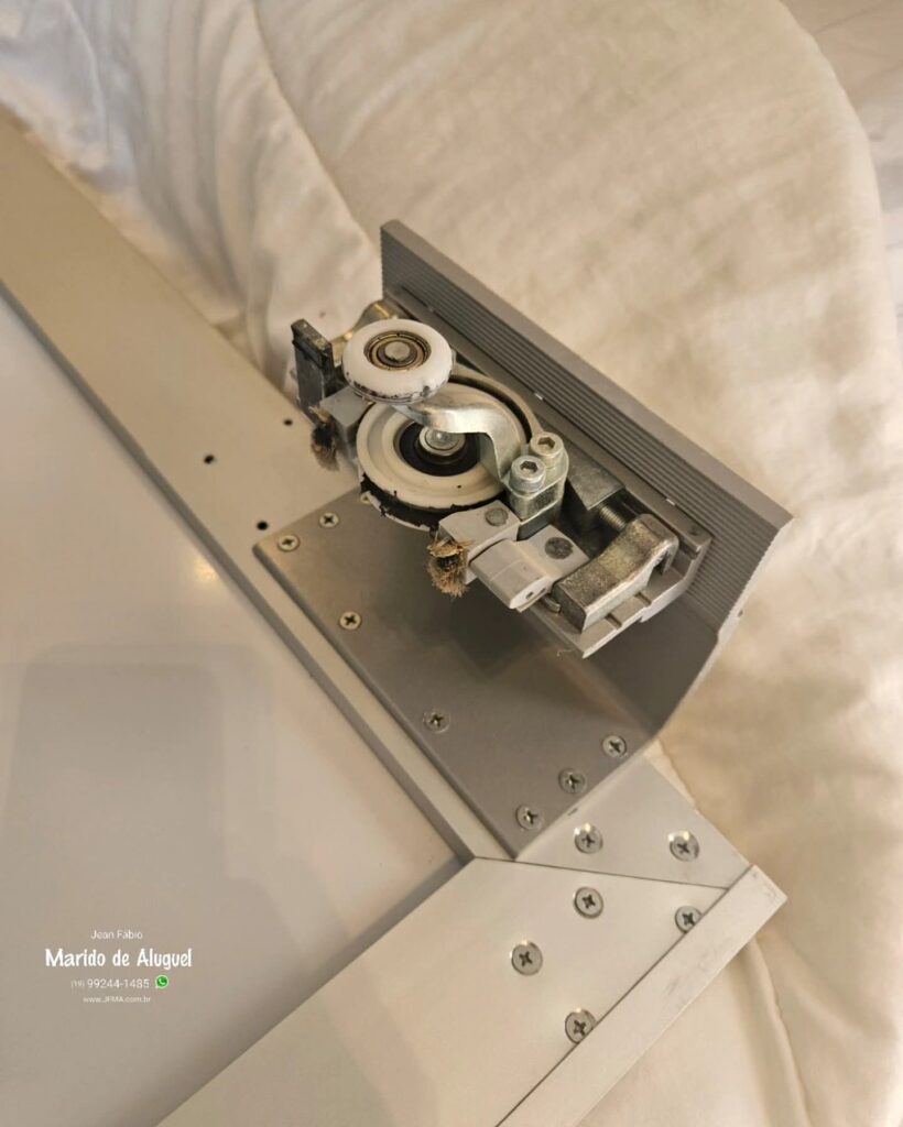 Nessa casa fiz o reparo da porta de correr de um guarda-roupa planejado, que estava escapando toda hora do trilho. Ao verificar, identifiquei que o problema era na roldana, a rodinha tinha saído do lugar e estava toda desalinhada. Retirei a porta, analisei a roldana e vi que ela ainda estava em boas condições, só estava torta e mal posicionada. Fiz o alinhamento certinho, desentortei a roldana e mudei o ponto de fixação, porque o local antigo já estava com a madeira espanada. Parafusei tudo novamente em um ponto mais firme, recoloquei a porta no lugar e fiz os ajustes finais. O resultado foi uma porta bem firme, sem escapar do trilho e correndo suave dos dois lados. Serviço recuperado com cuidado, economia para o cliente e acabamento bem feito.