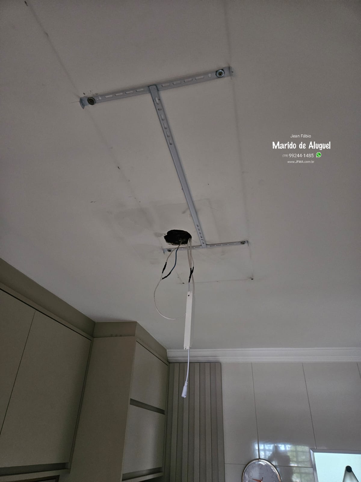 Então eu fui lá, fiz a fixação do novo suporte no teto e realizei a instalação da luminária, deixando tudo bem alinhado e seguro.