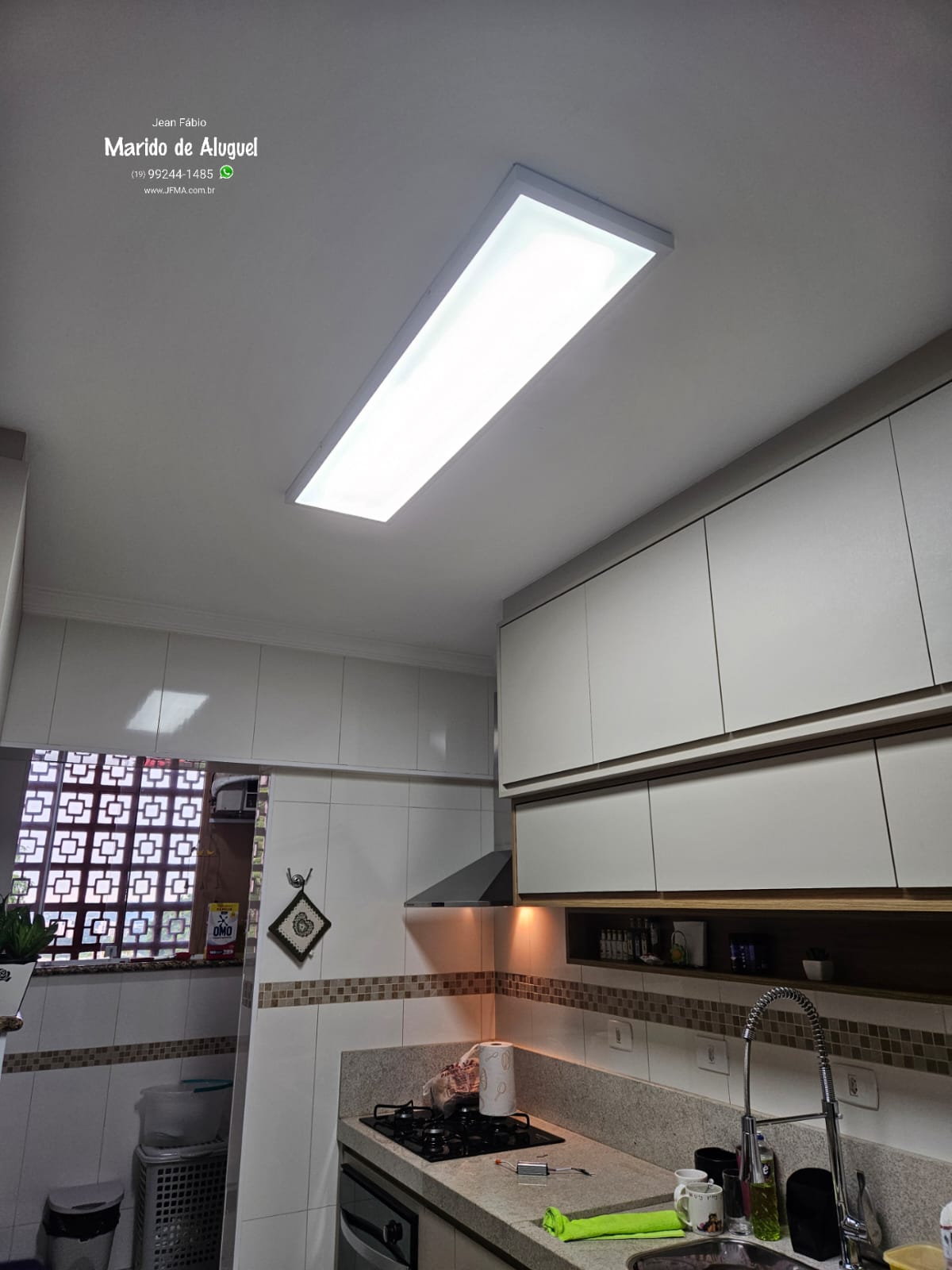 Nessa cozinha, o plafon de LED antigo, de aproximadamente 60 cm, acabou quebrando e precisou ser substituído.