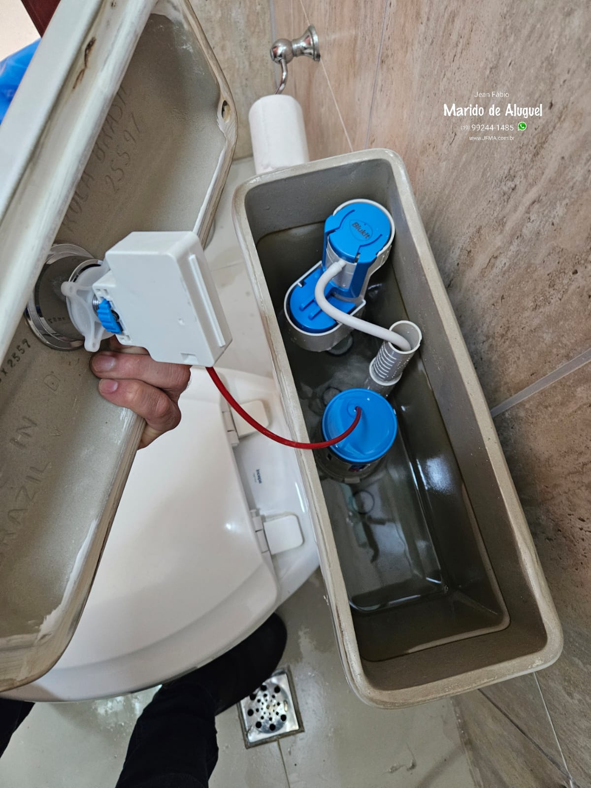 Aqui fiz a troca completa do kit de descarga da caixa acoplada, resolvendo de vez problemas de funcionamento e possíveis vazamentos. Comecei removendo todo o kit antigo, que já estava desgastado, e fiz a limpeza da caixa pra garantir uma instalação correta das peças novas.