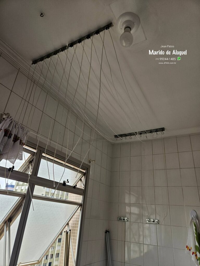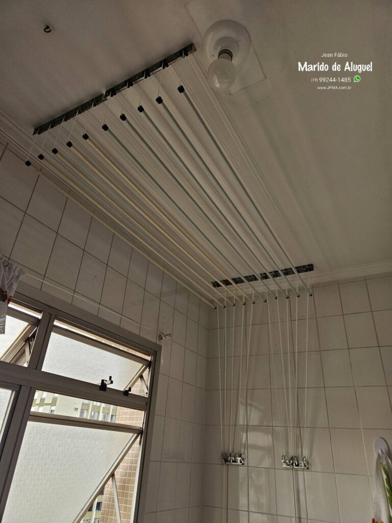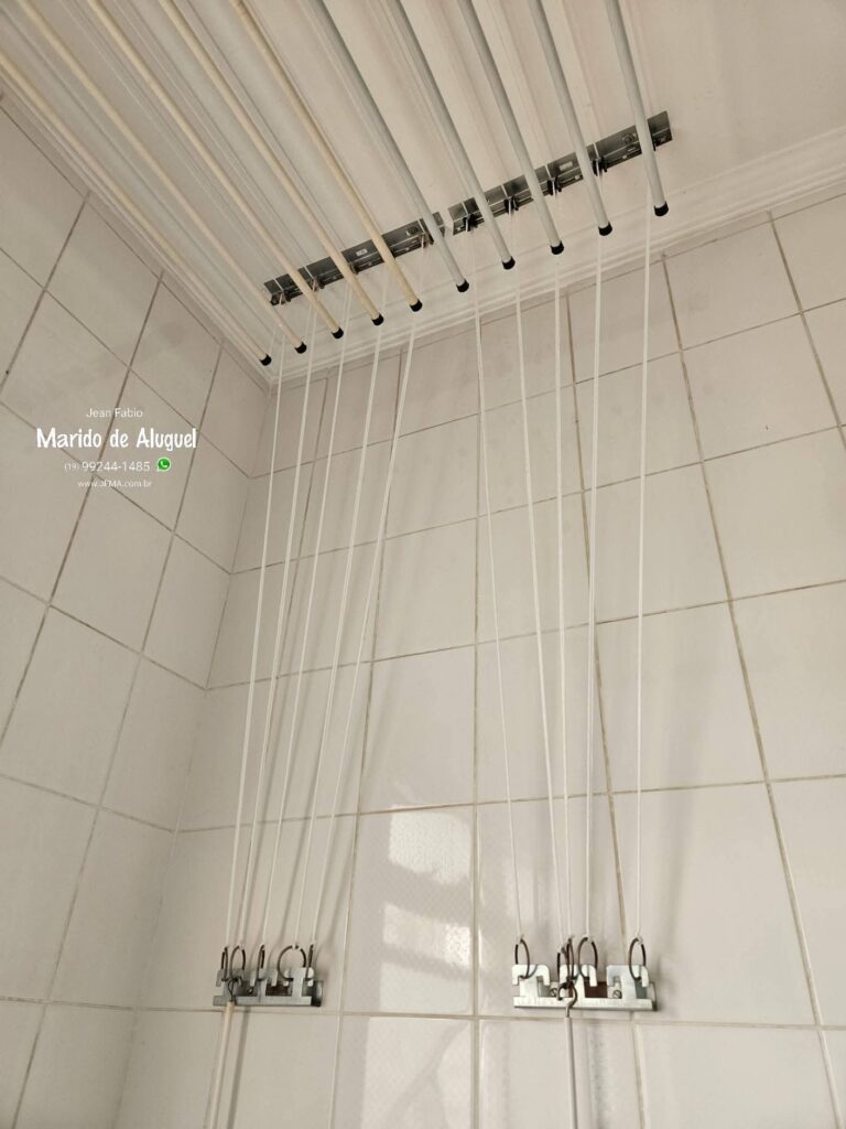Nesta casa, fiz a substituição das cordas de dois varais de teto individuais, instalados lado a lado. Com o tempo, as cordas acabam desgastando e dificultam o uso no dia a dia.