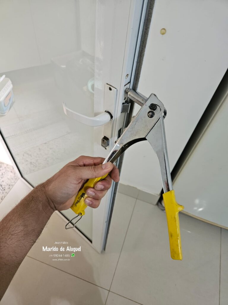 Nesse caso, como o parafuso já não tinha mais aderência, utilizei rebites para fazer uma nova fixação. Rebitei a fechadura na porta de alumínio, deixando tudo bem firme, seguro e com excelente acabamento.